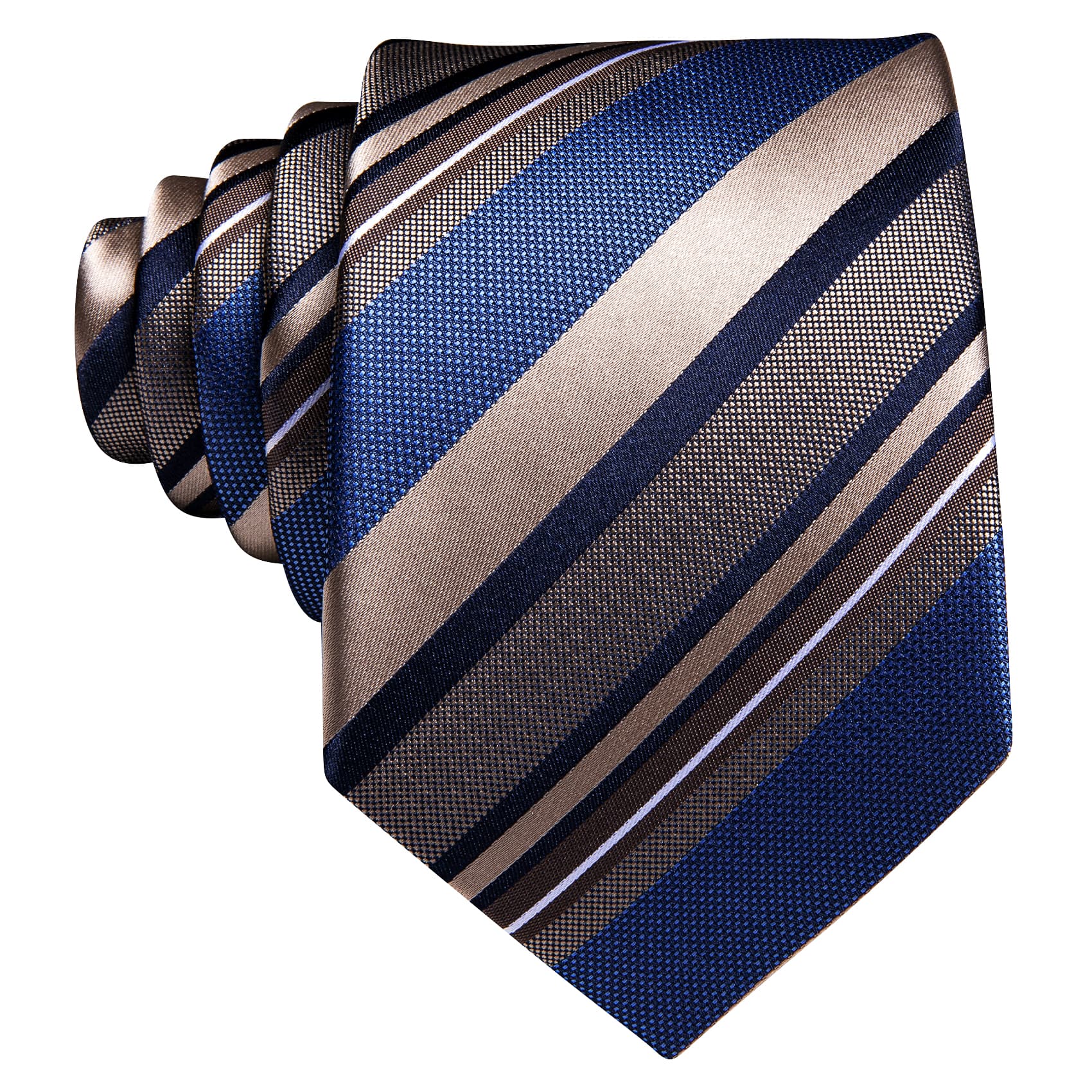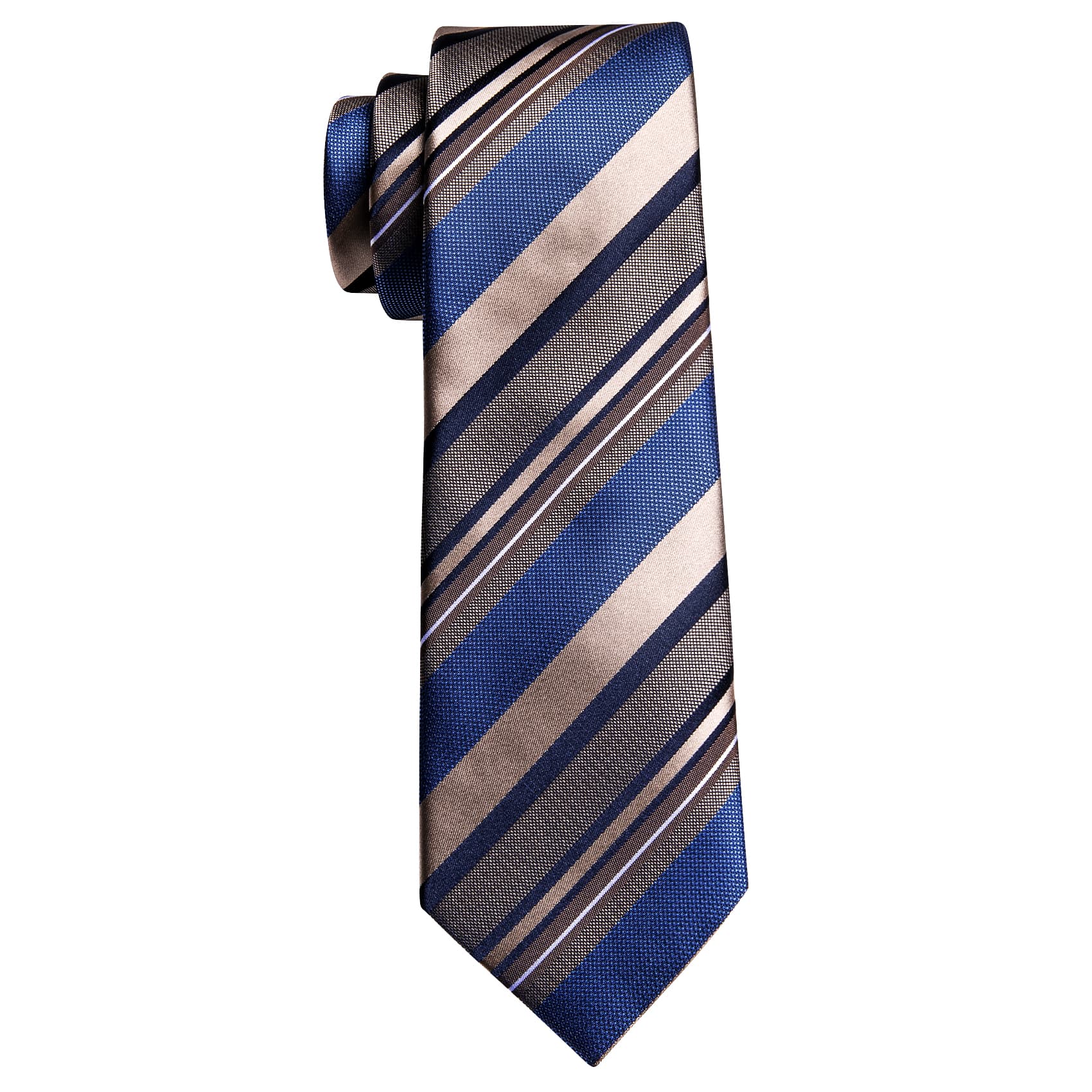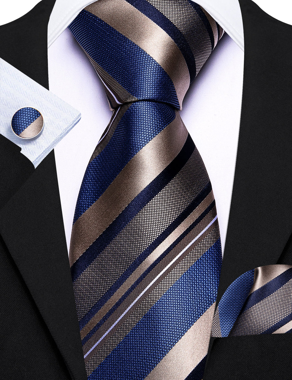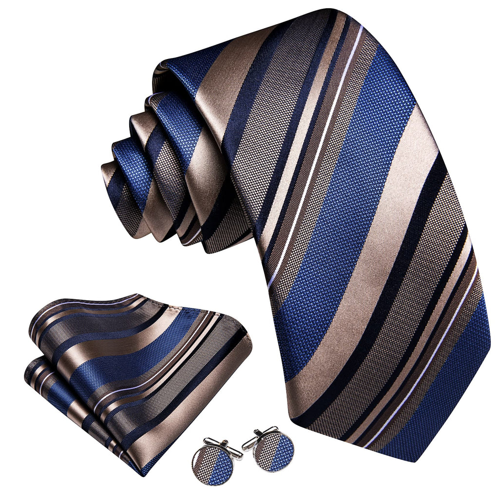 Barry. Wang Striped Tie Deep Blue Tan Mens Business Work Tie Pocket Square Cufflinks Set