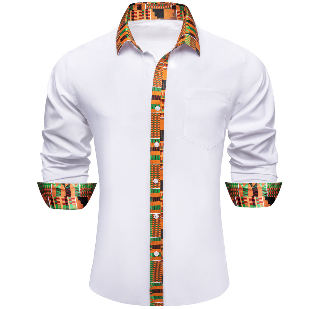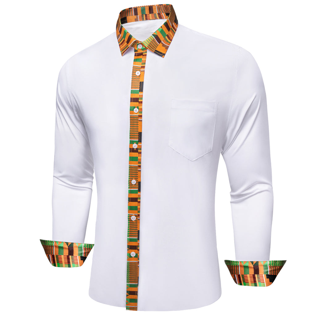 Barry. Wang White Yellow Patchwork Shirt Mens Silk Long Sleeve Button Down Novelty Shirt