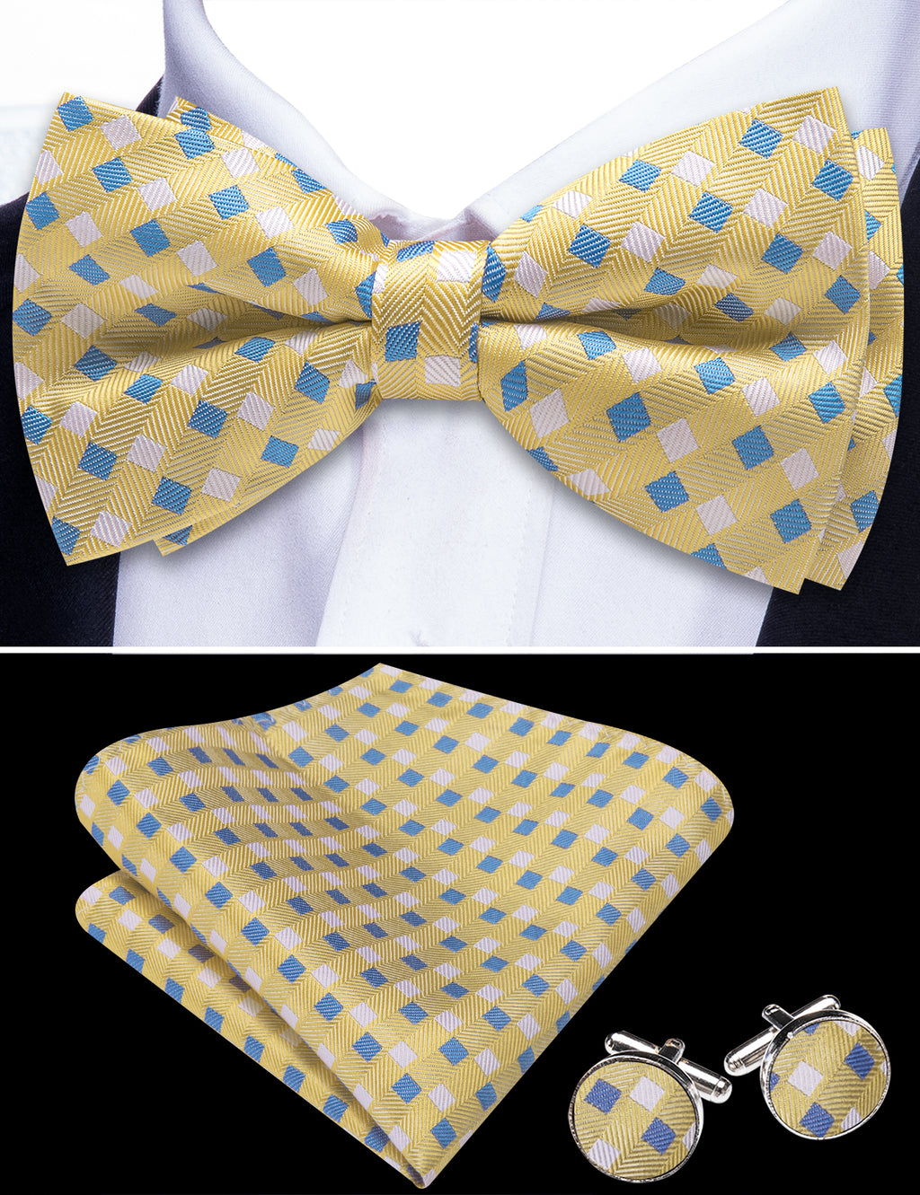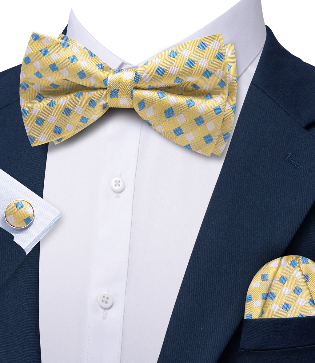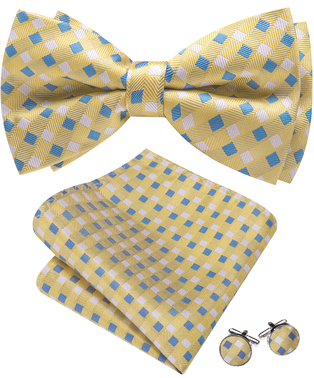 Barry. Wang Yellow Bow Tie Hanky Cufflinks Set Blue Plaid Pre-tied Silk Men's Tuxedo Bow Tie Hanky Cufflinks Set for Wedding