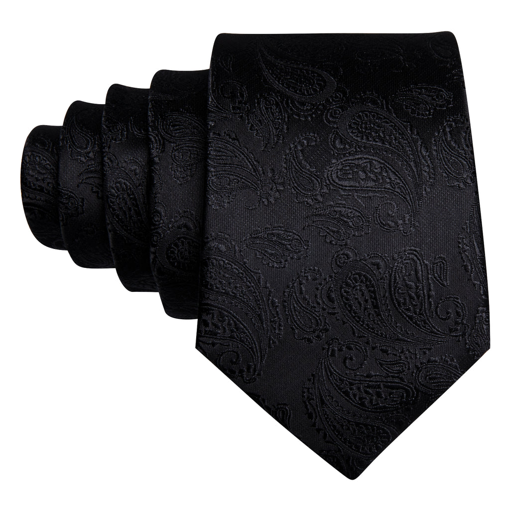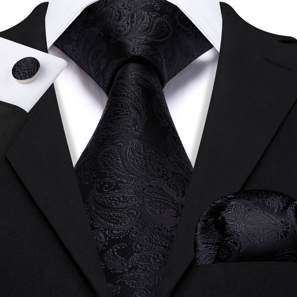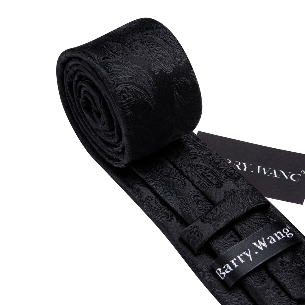 Barry. Wang Black Tie Paisley Silk 63 Inches Extra Long Tie Pocket Square Cufflinks Set