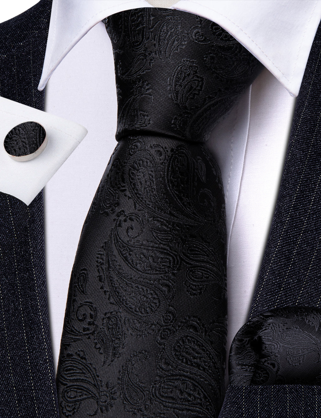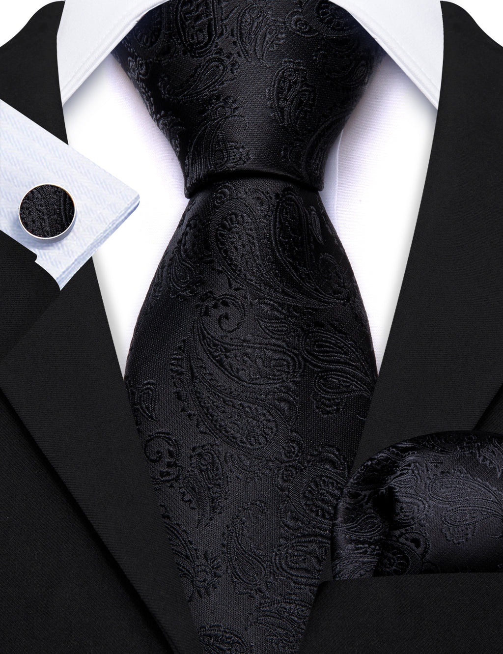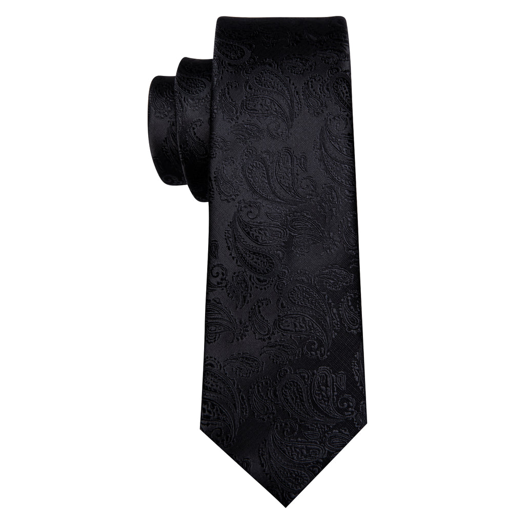 Barry. Wang Black Tie Paisley Silk 63 Inches Extra Long Tie Pocket Square Cufflinks Set