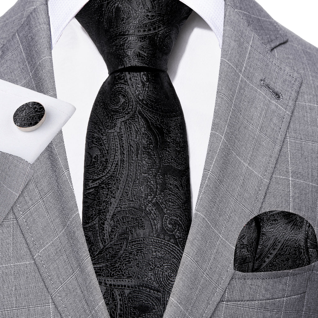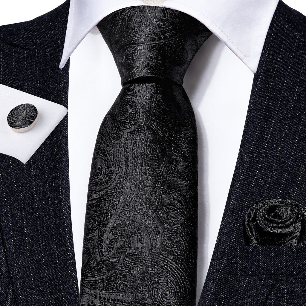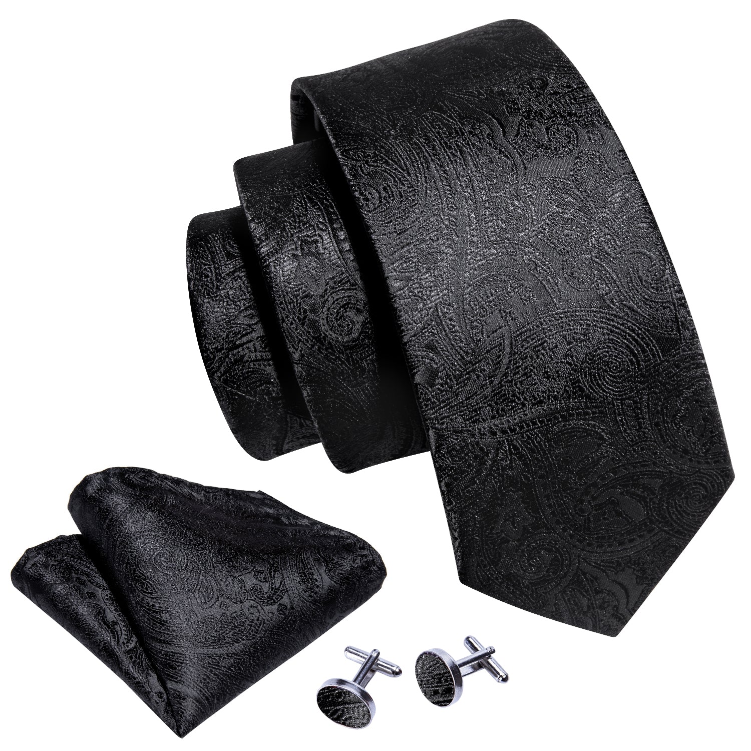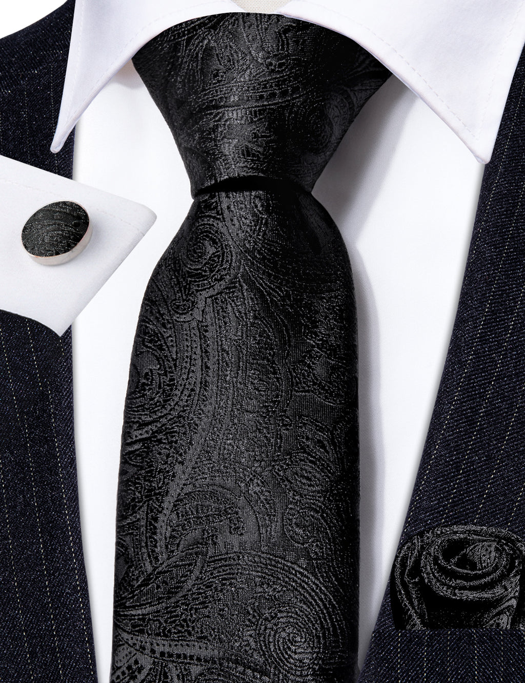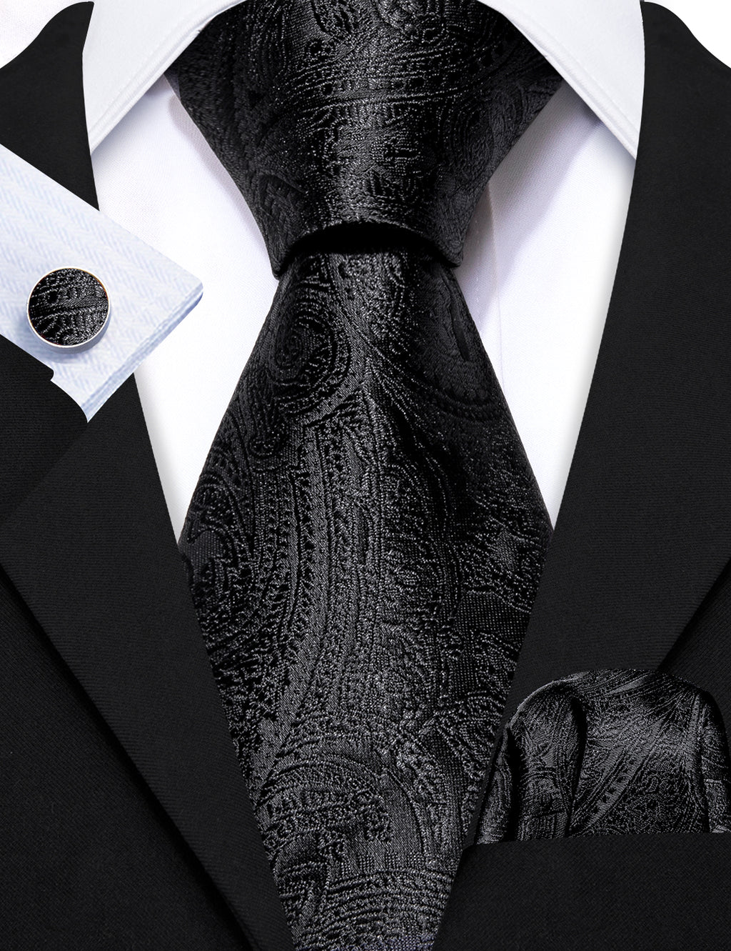 Barry. Wang Men's Black Paisley Tie Pocket Square Cufflinks Set