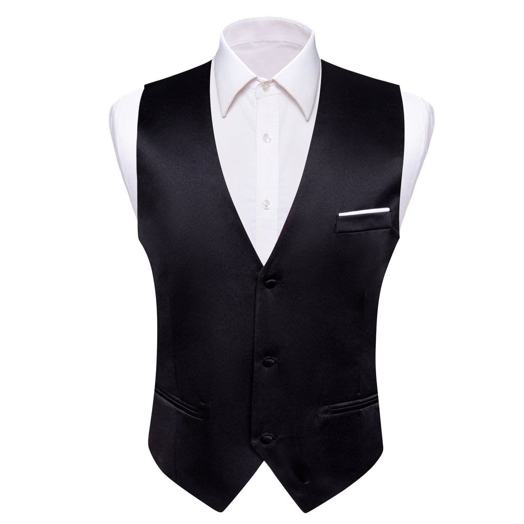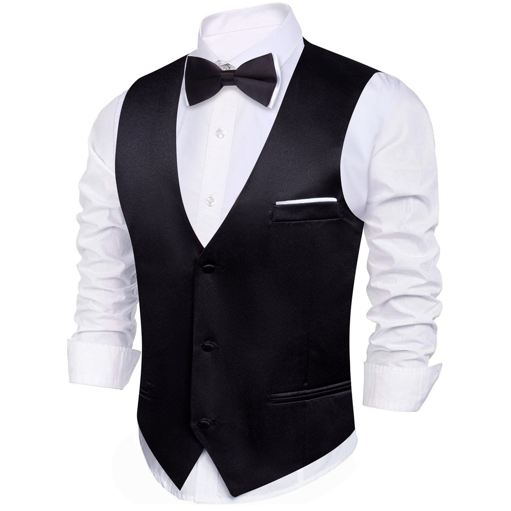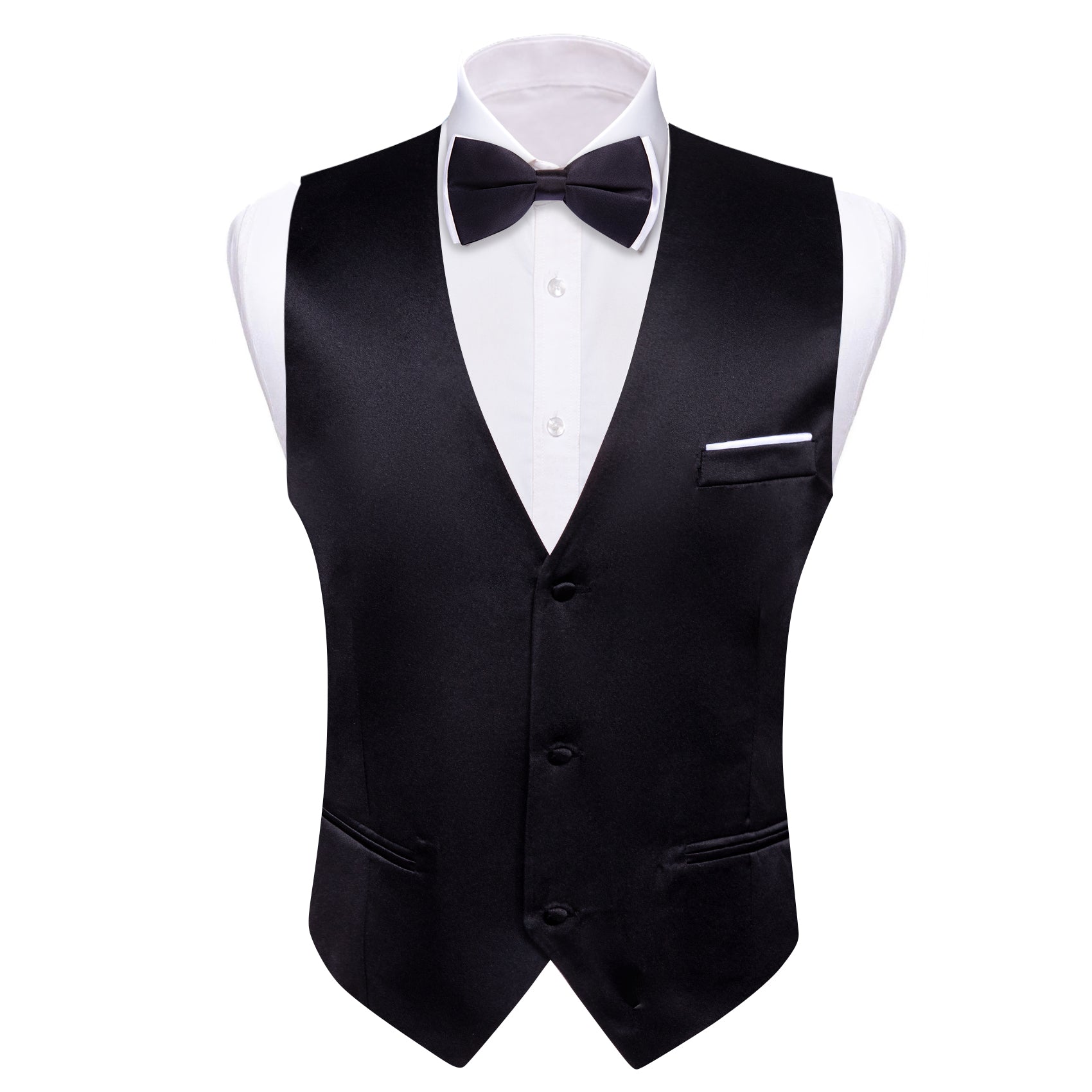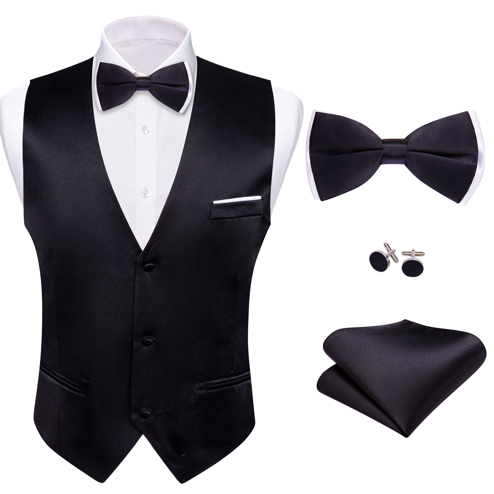 Barry. Wang Mens Dress Waistcoat Black Solid V-neck Formal Vest Bowtie Hanky Cufflinks Set