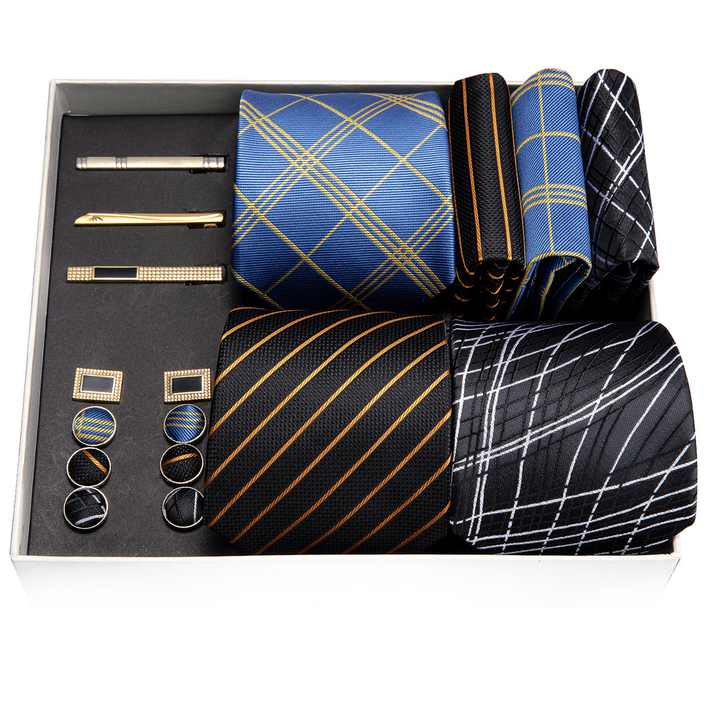 Barry. Wang Blue Black Golden Striped Silk Wedding Necktie Gift Box Set