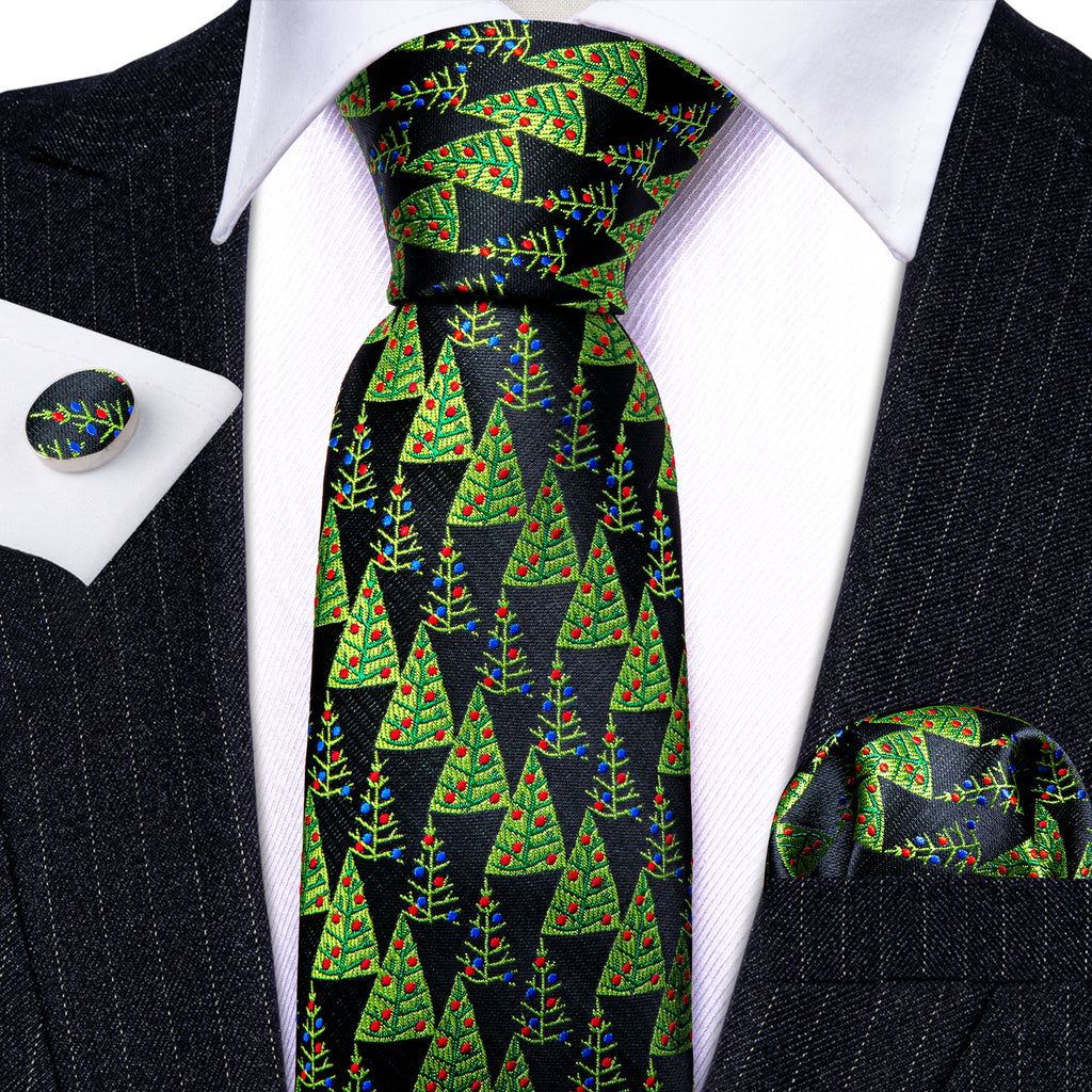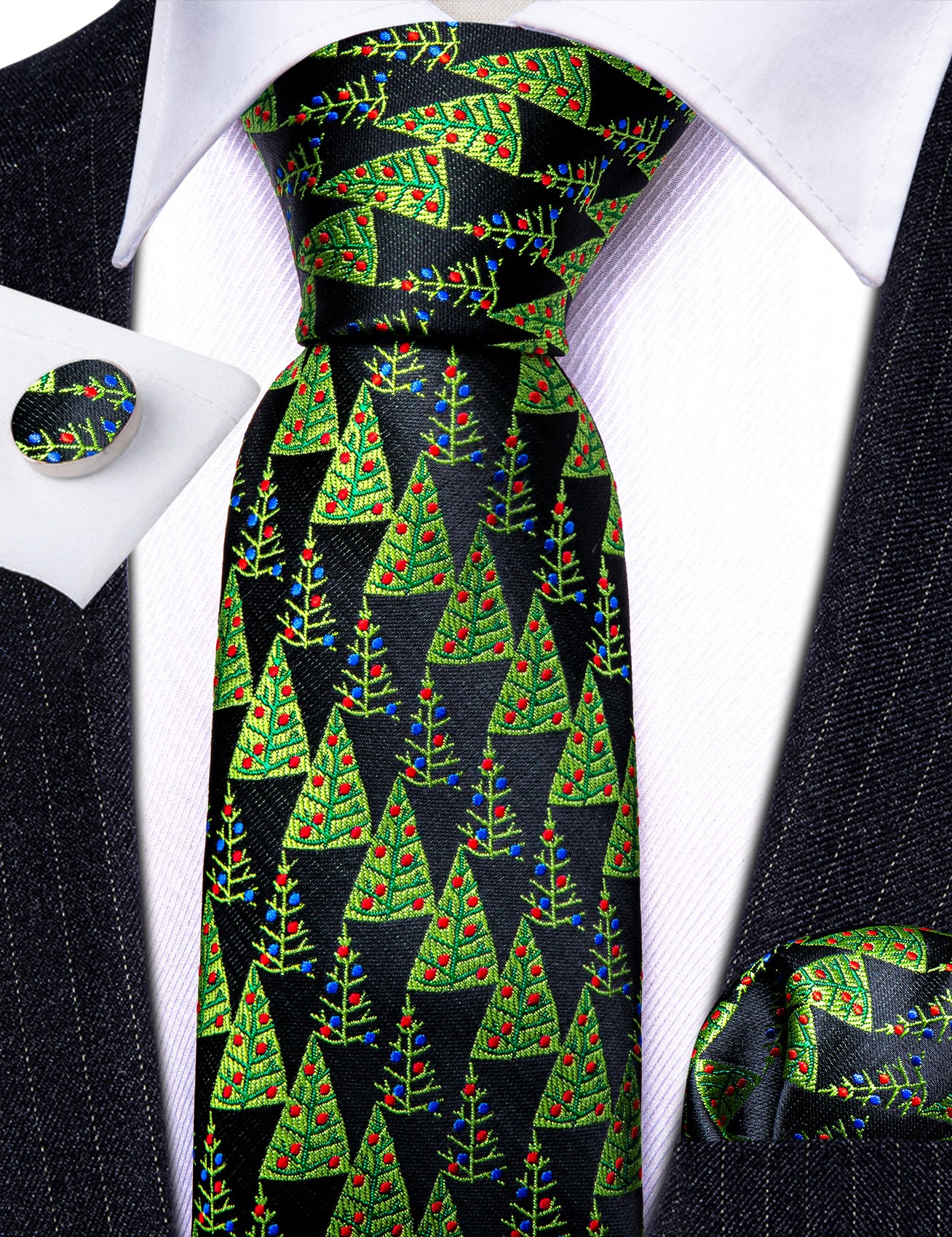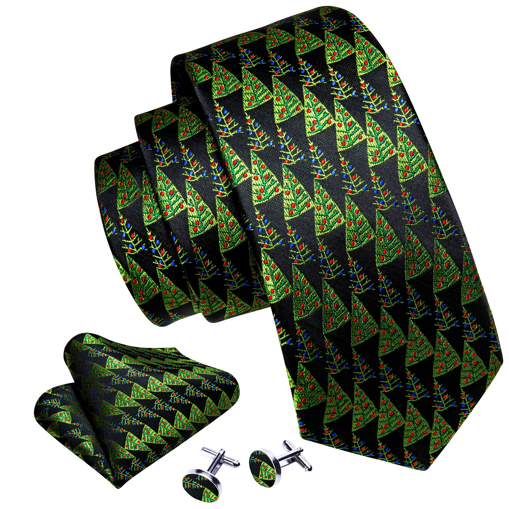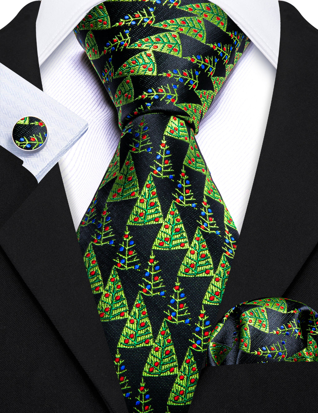 Barry. Wang Silk Holiday Necktie Xmas Green Tree Tie Handkerchief Cufflinks Set