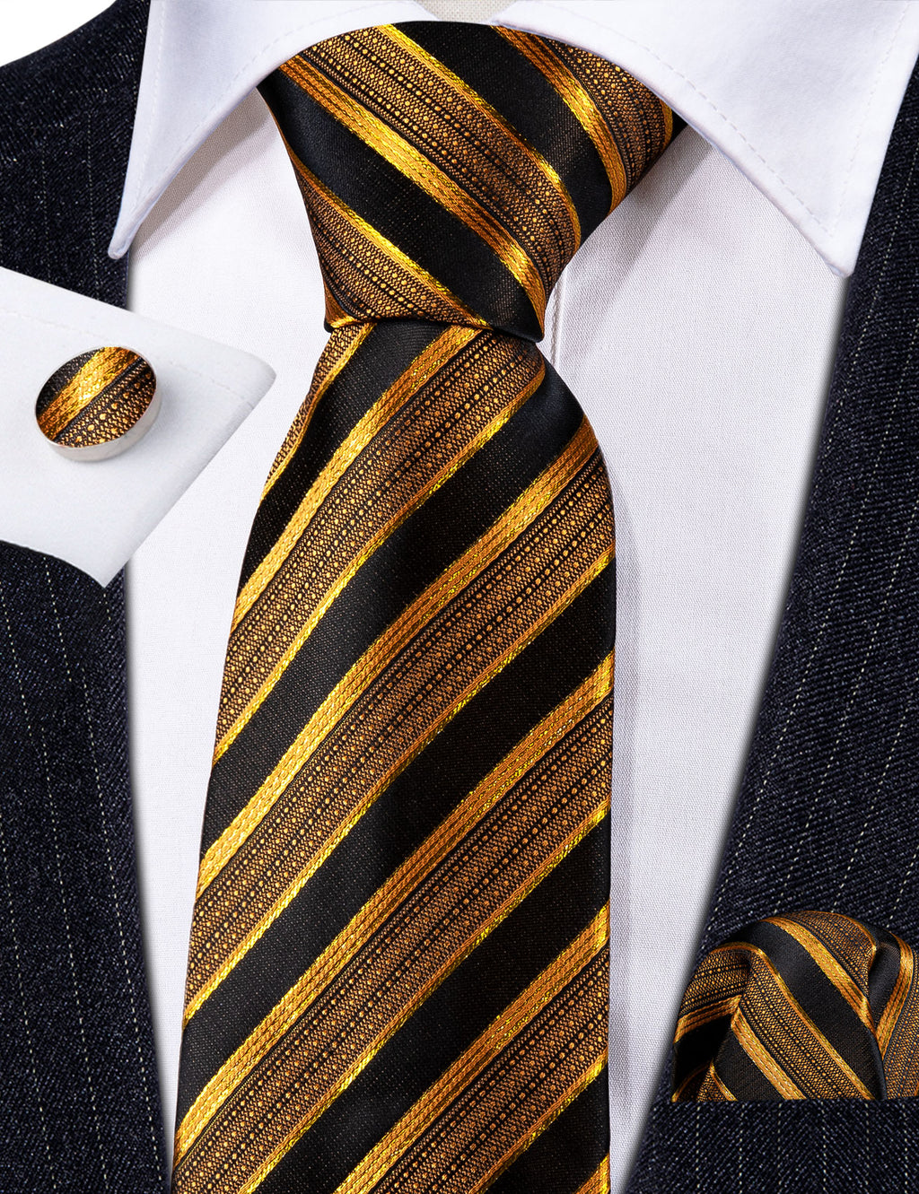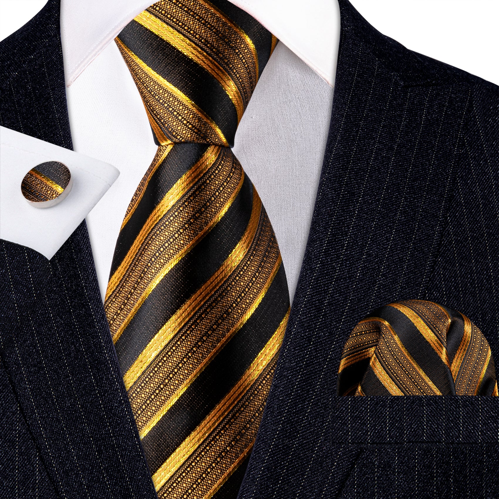 Barry. Wang Black Tie Gold Striped Silk Necktie Handkerchief Cufflinks Set for Men Business