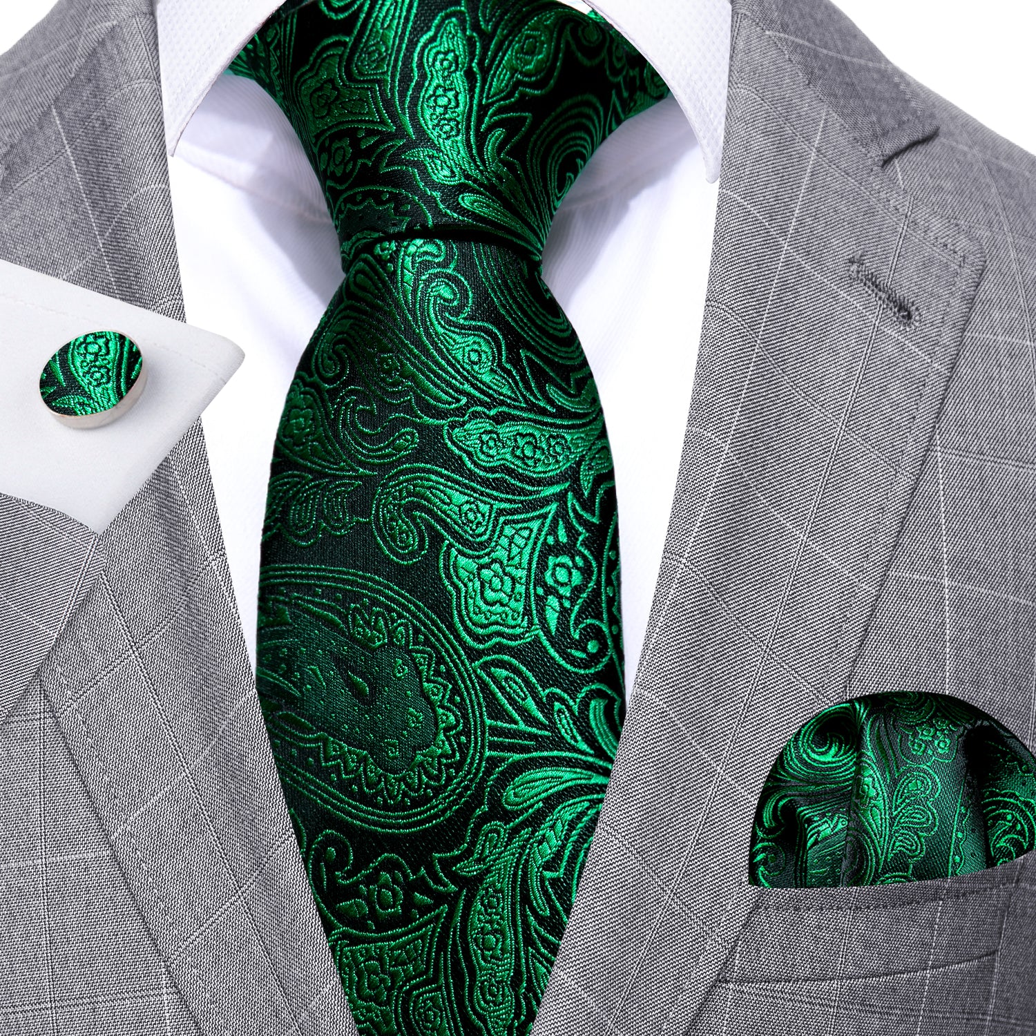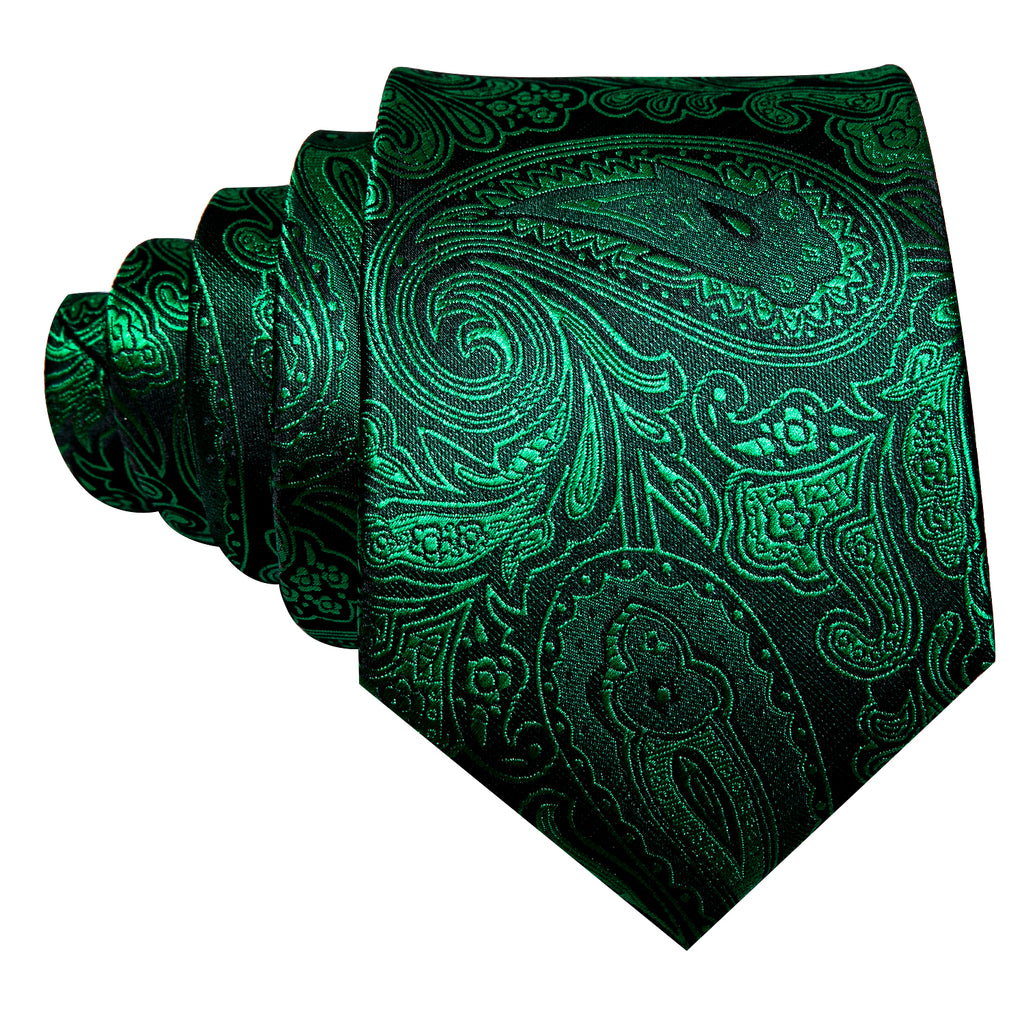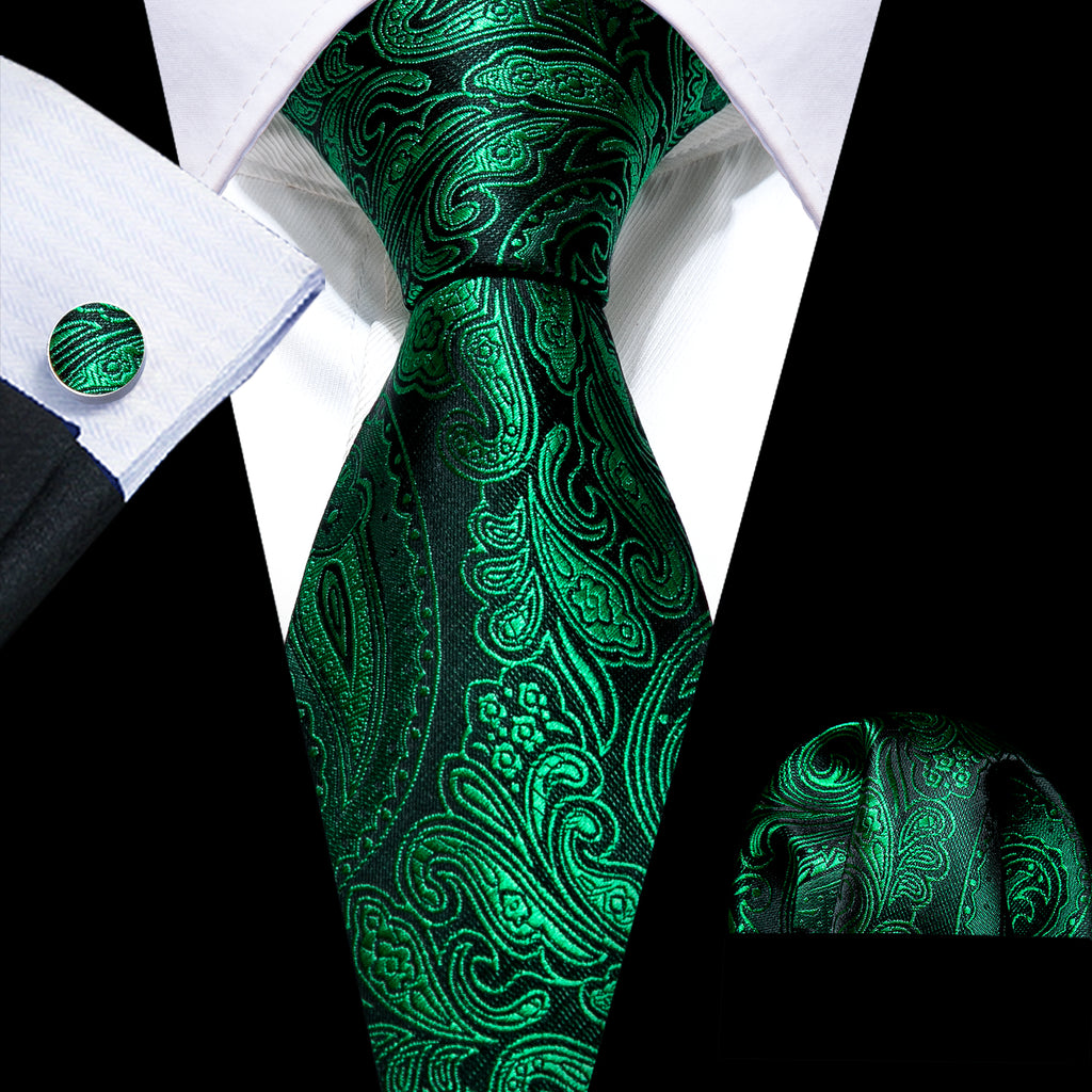 Barry. Wang Dark Green Tie Paisley Silk Tie Handkerchief Cufflinks Set