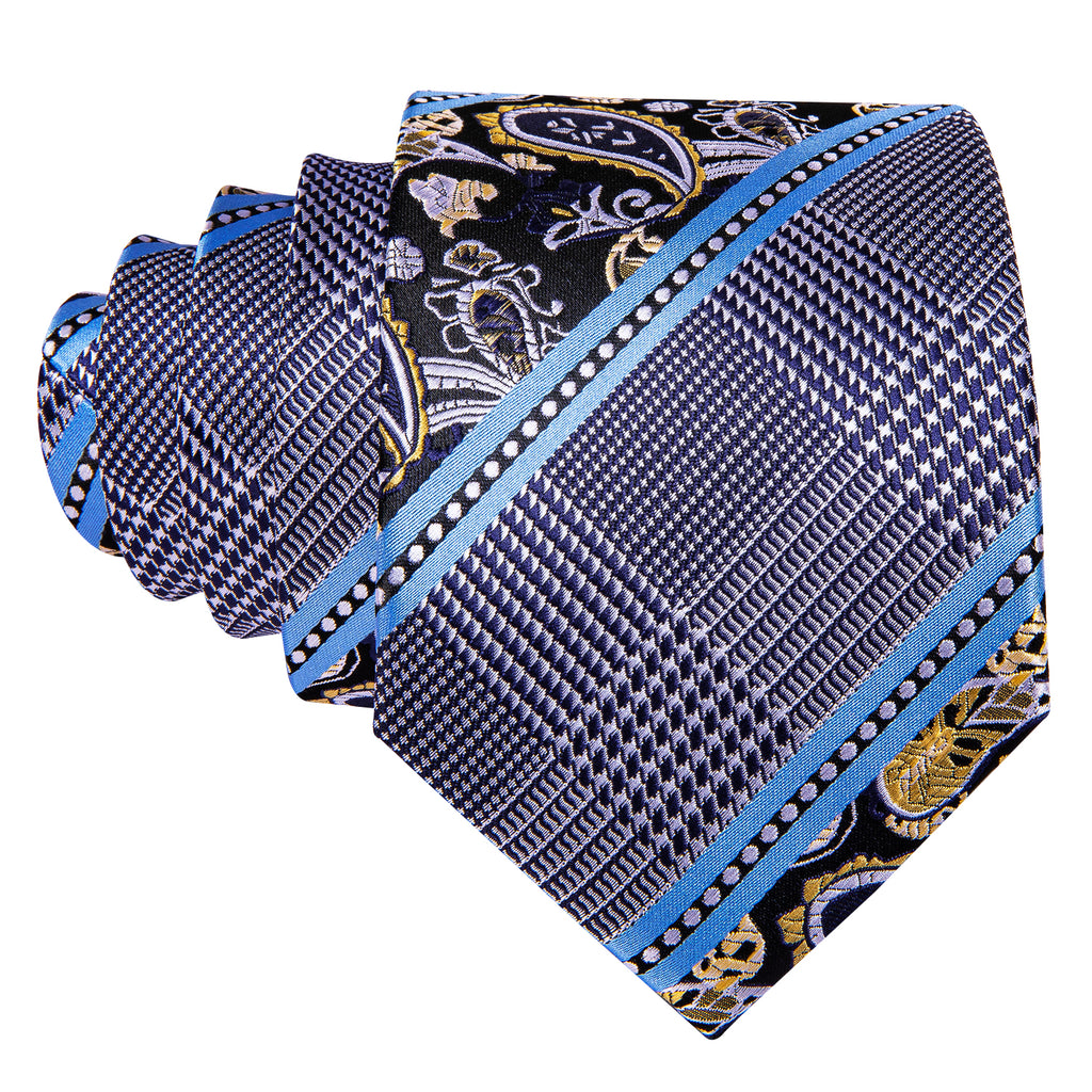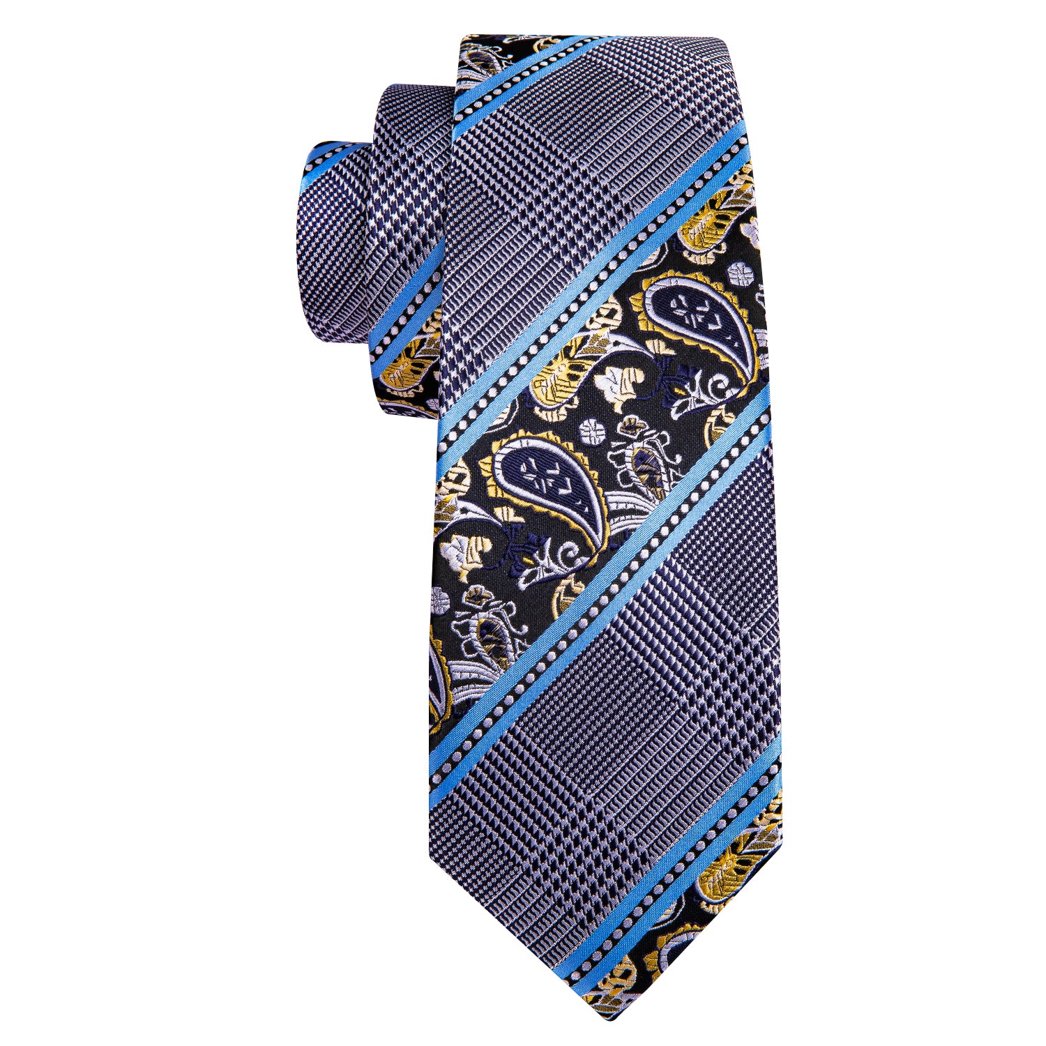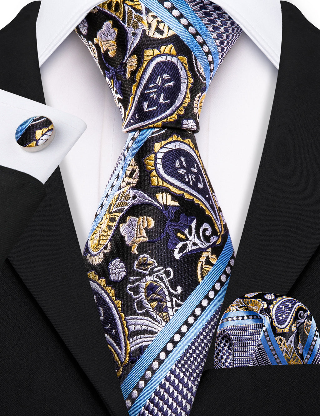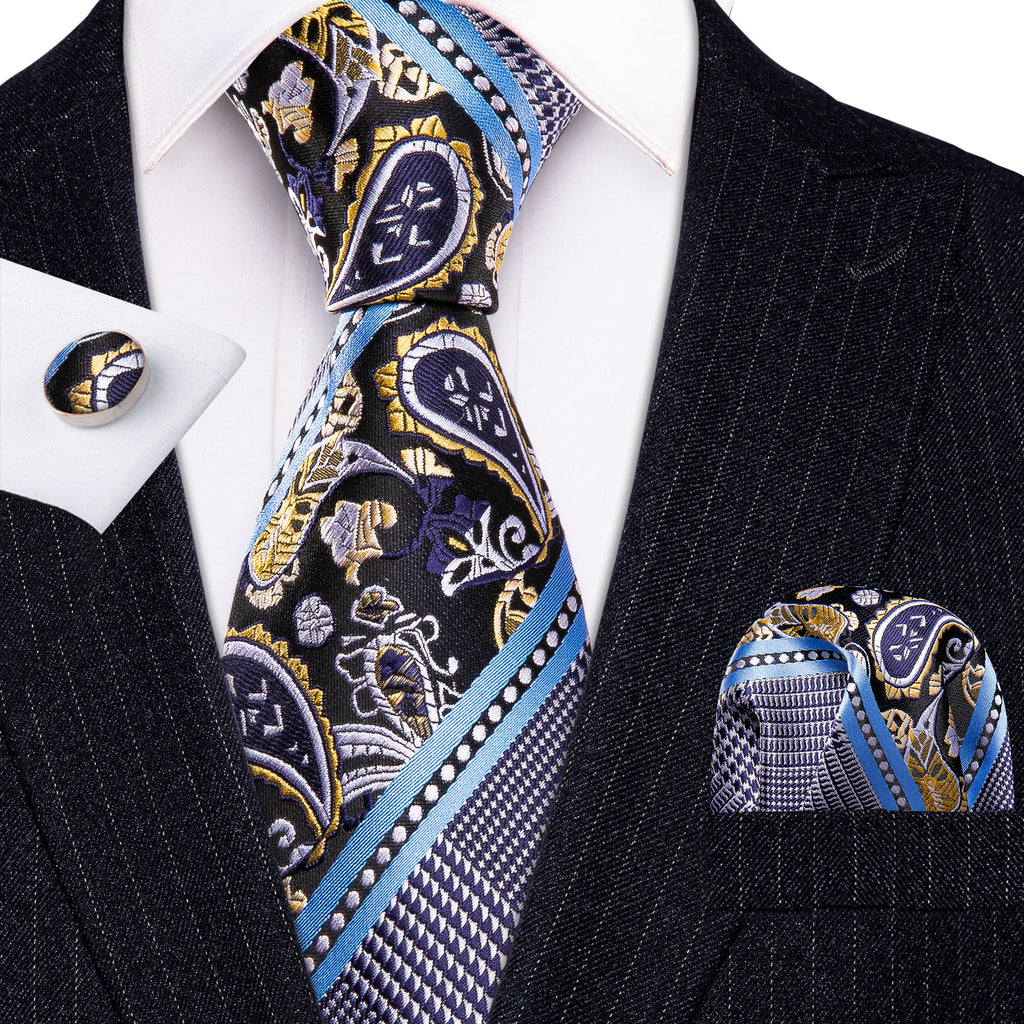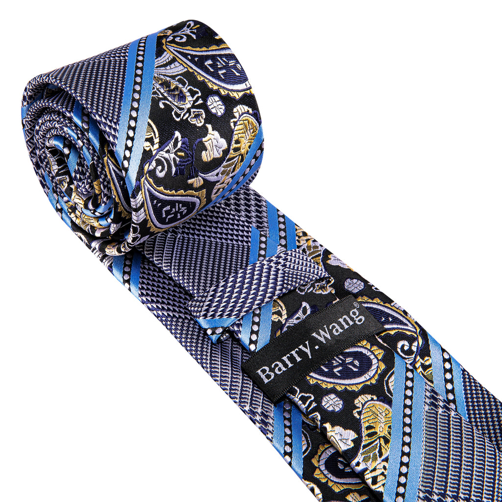 Barry. Wang Paisley Tie Black Blue Necktie Pocket Square Cufflinks Set for Men