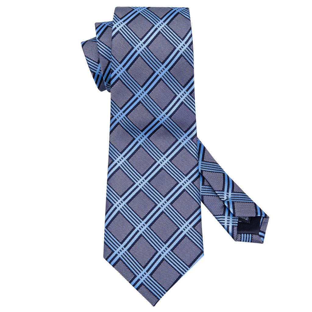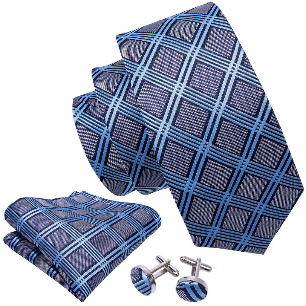 Barry. Wang Grey Blue Plaid Silk Men's Tie Pocket Square Cufflinks Set