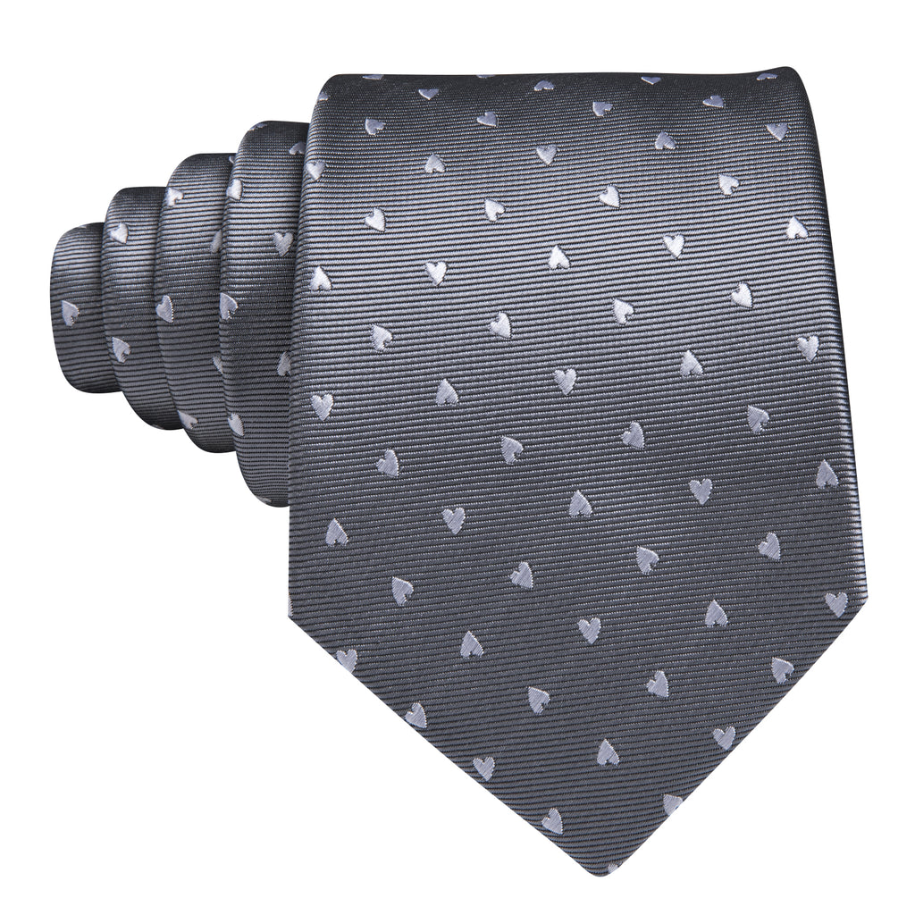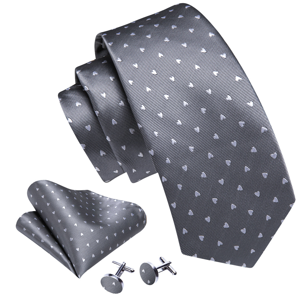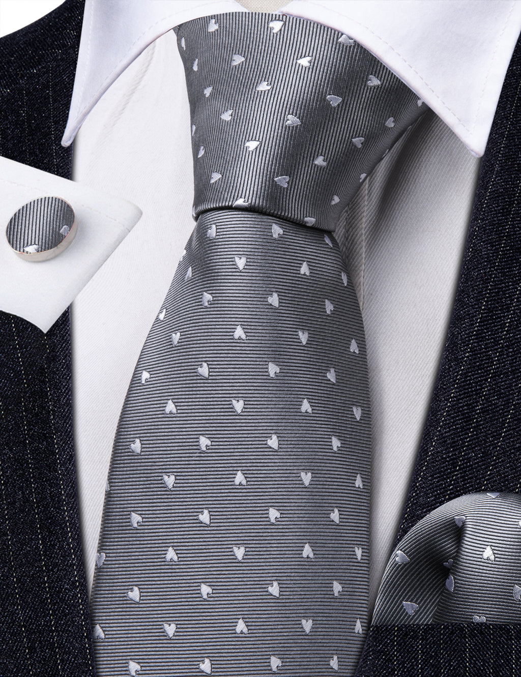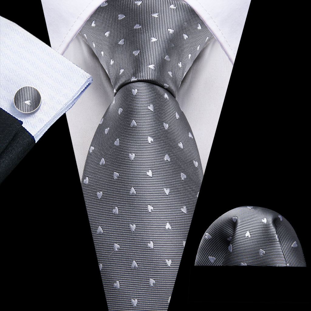 Barry. Wang Grey Ties White Heart Pattern Necktie Hanky Cufflinks Set