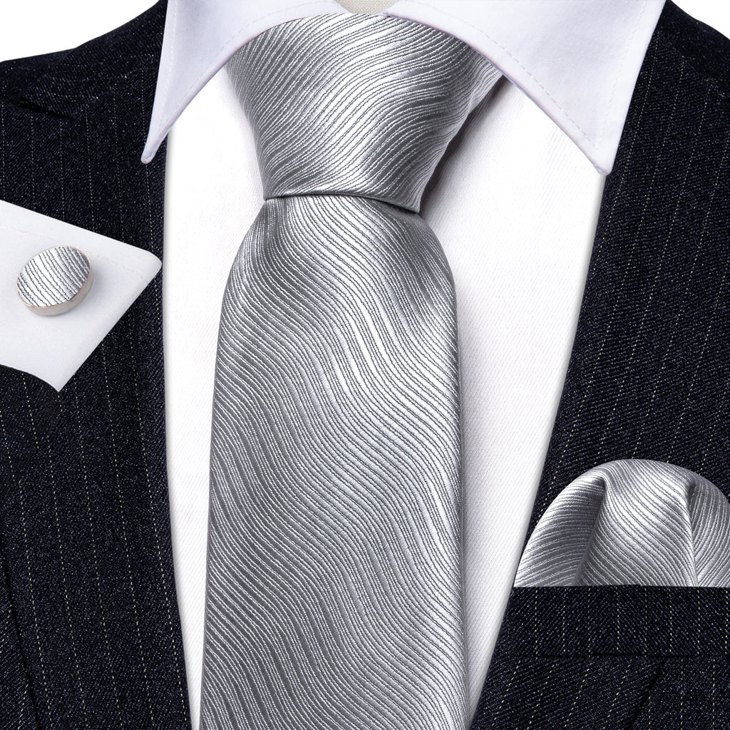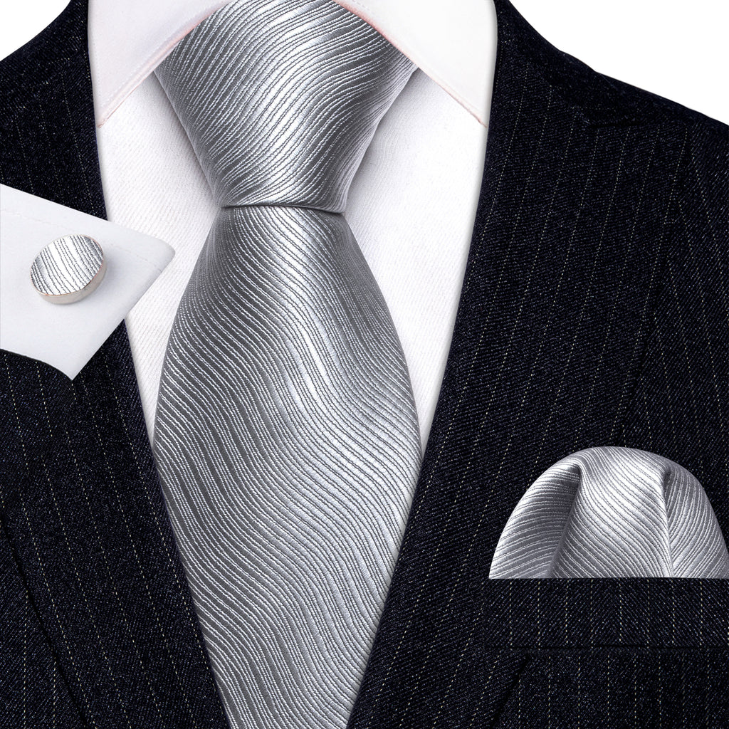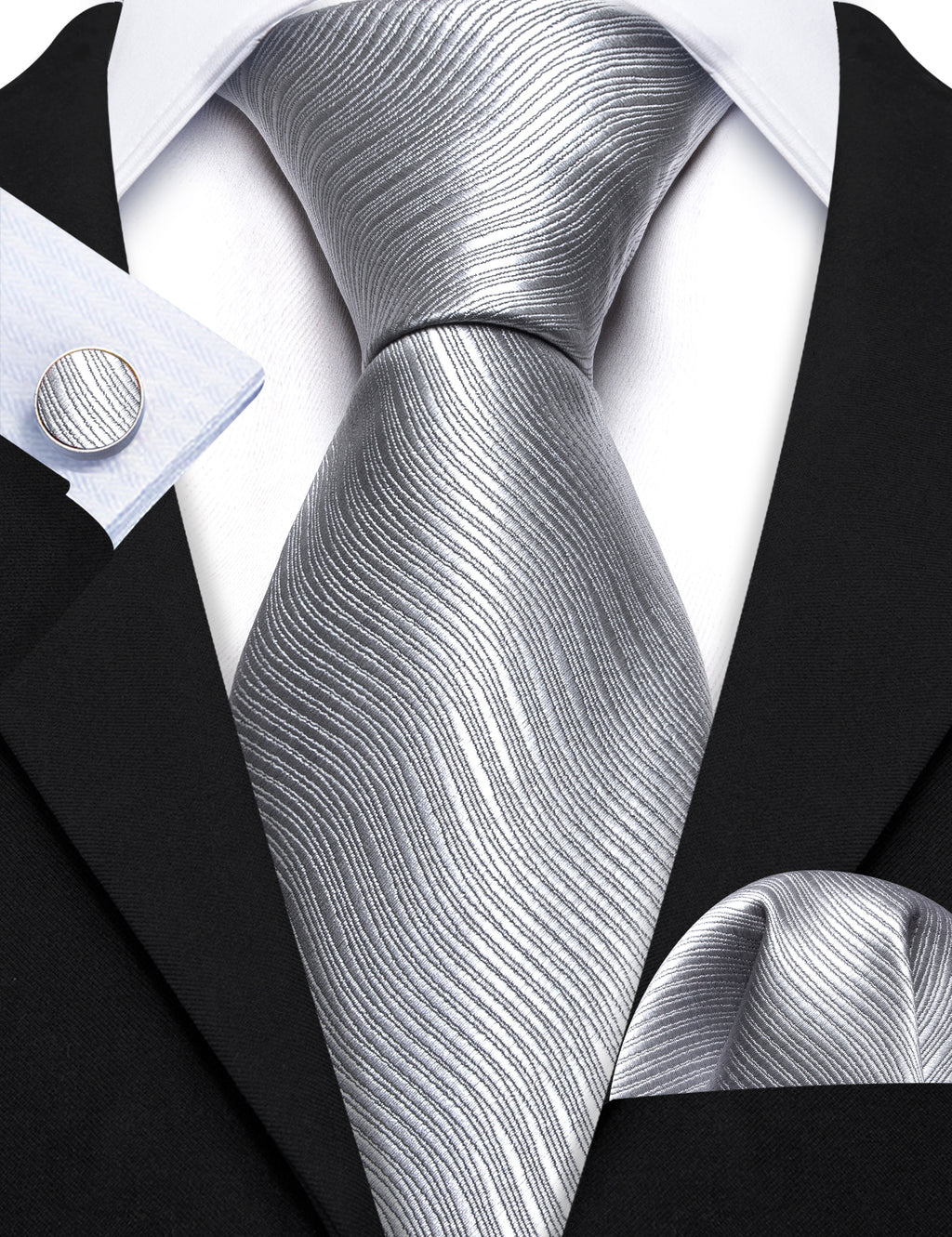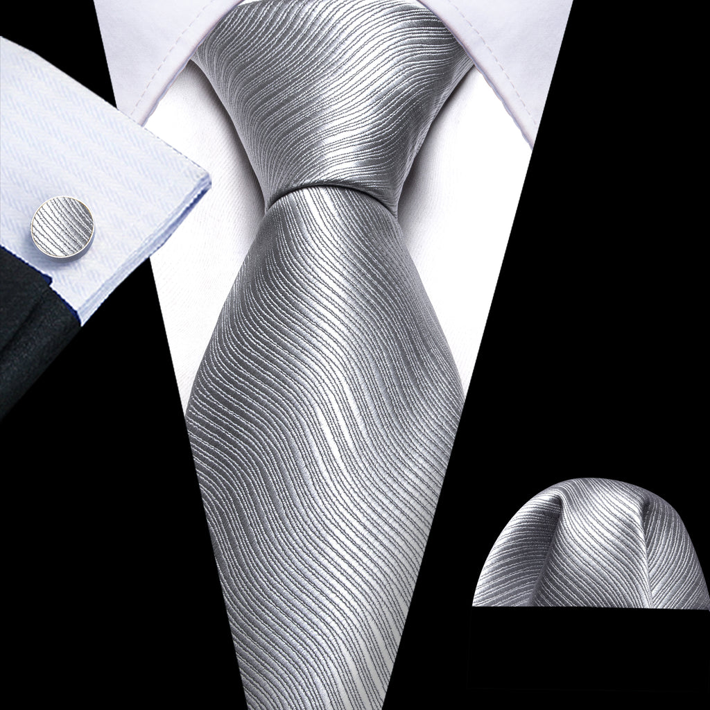 Barry. Wang Light Grey White Solid Silk Tie Handkerchief Cufflinks Set