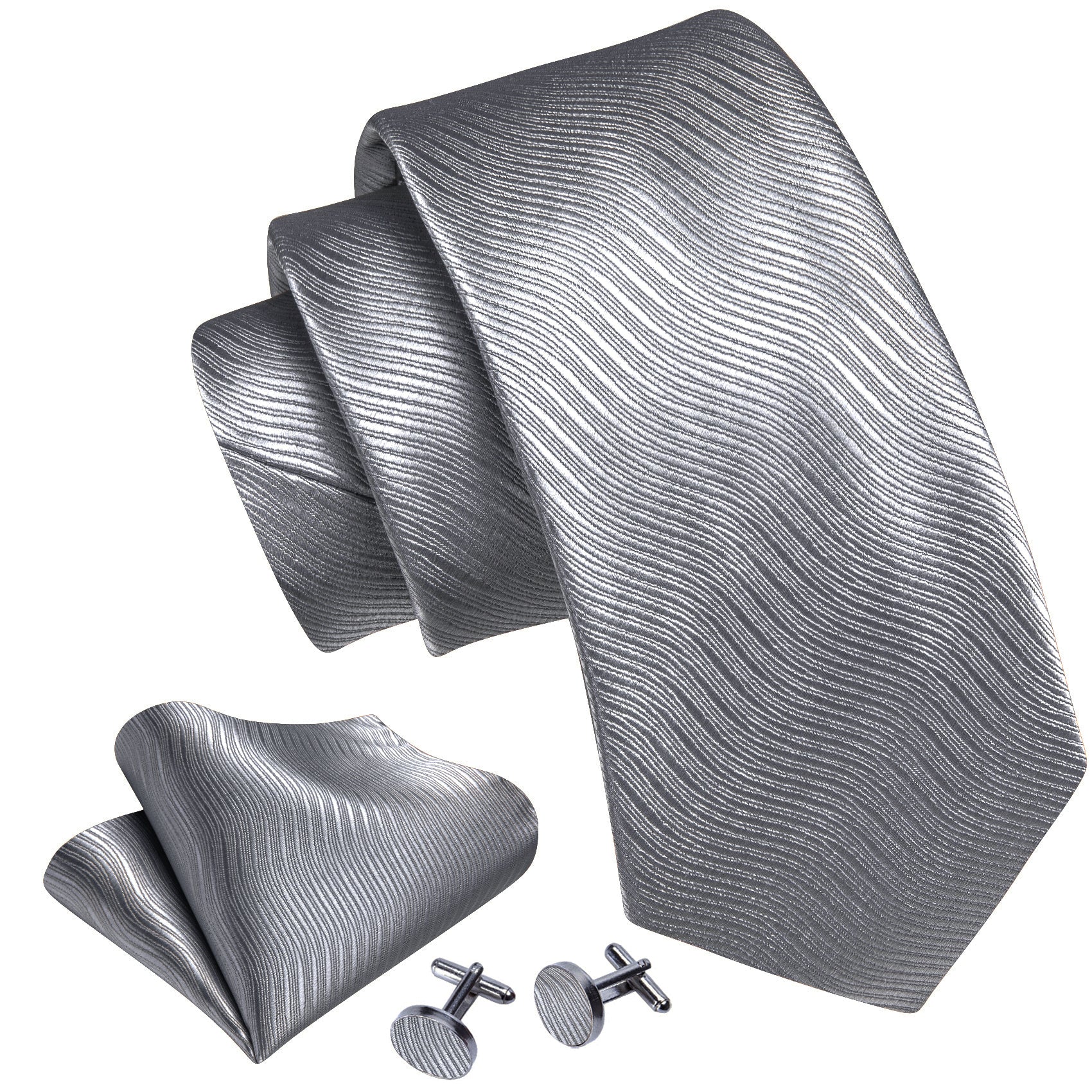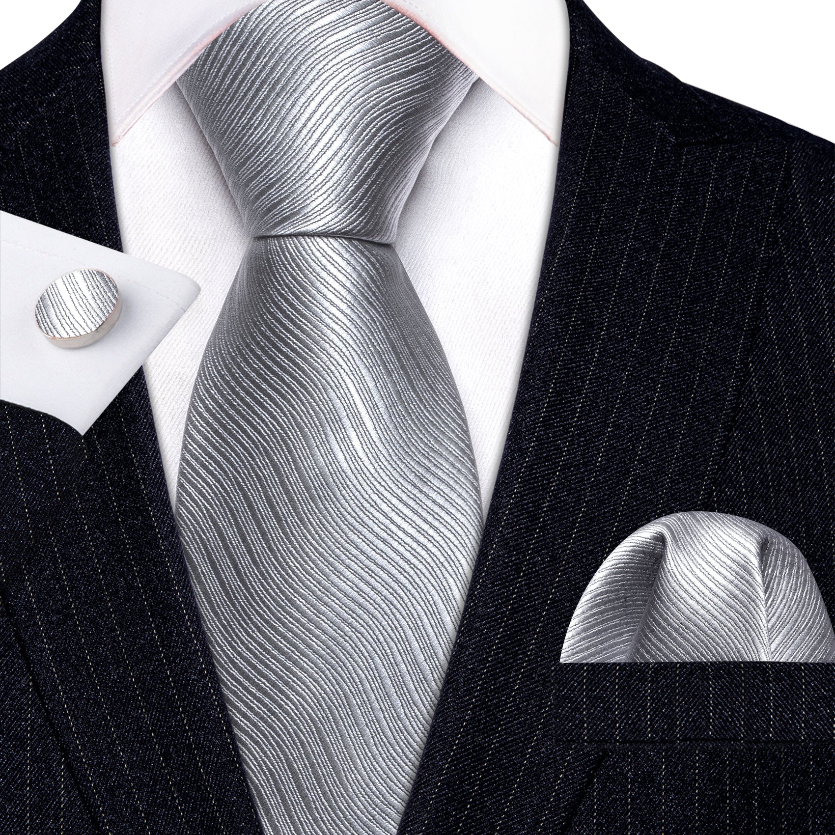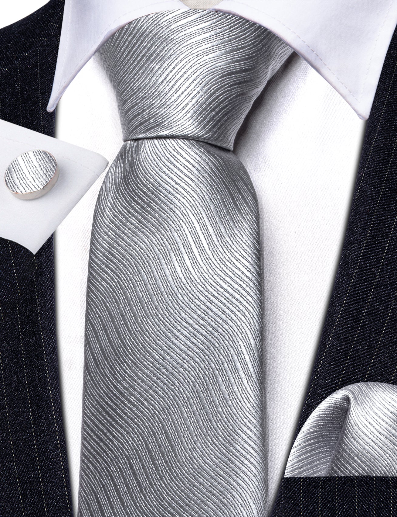 Barry. Wang Light Grey White Solid Silk Tie Handkerchief Cufflinks Set