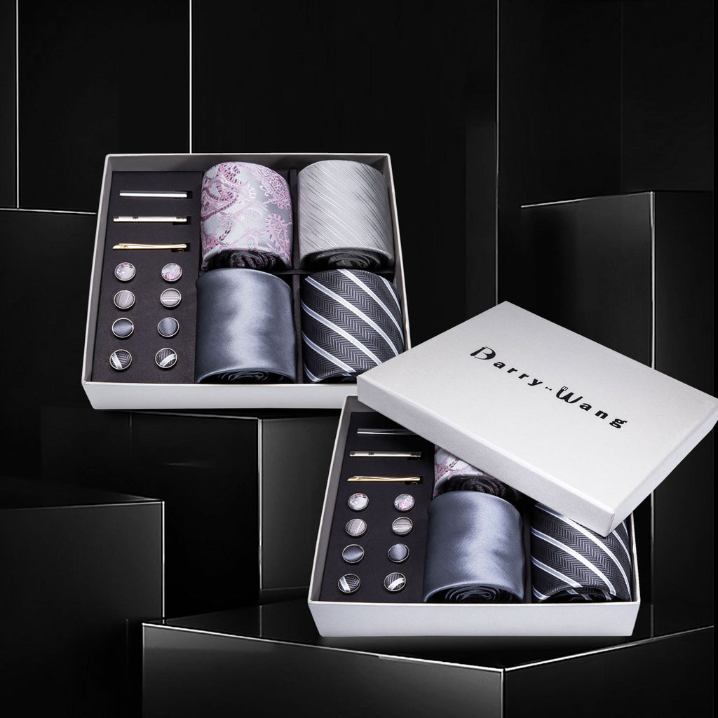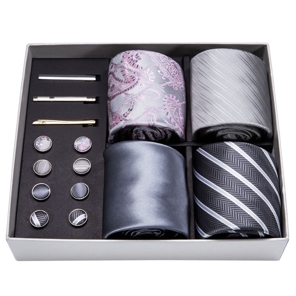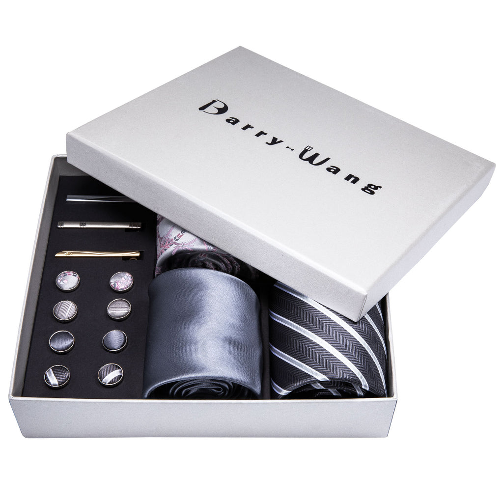 Barry. Wang Men Ties Gray Sliver Floral Silk Men Wedding Necktie Pocket Square Gift Box Set