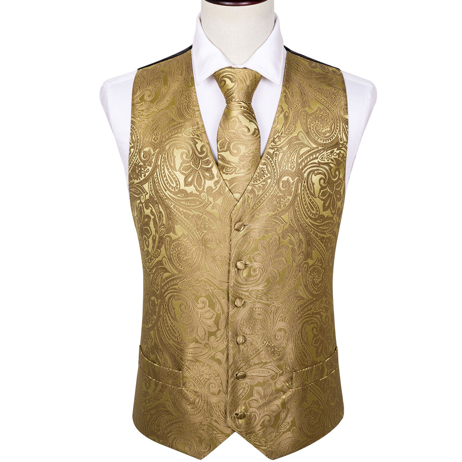 Barry. Wang Mens Gold Vest Suit 4PCS Silk Paisley Vest Necktie Hanky Cufflinks Set