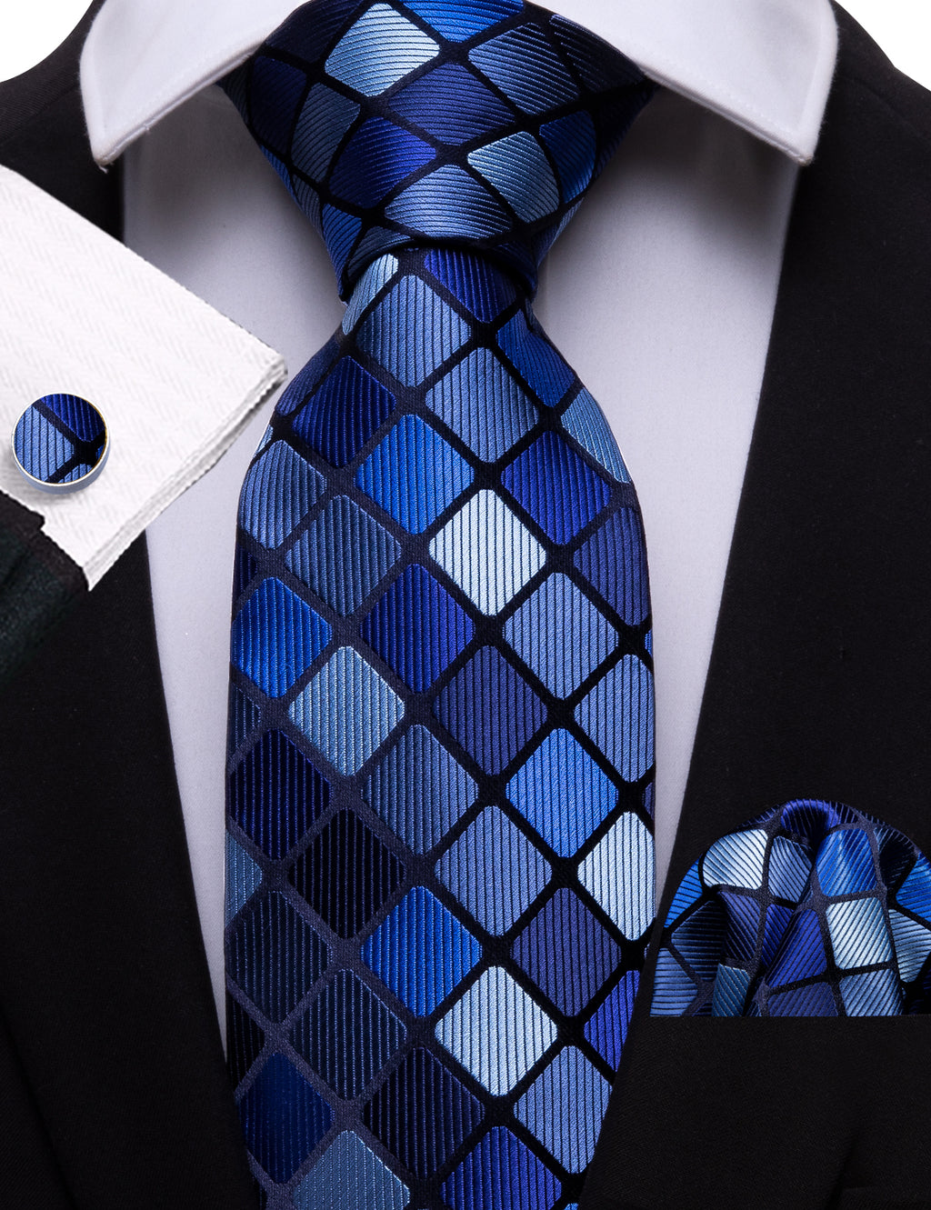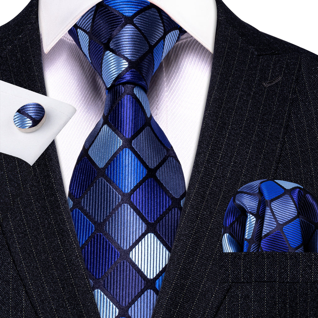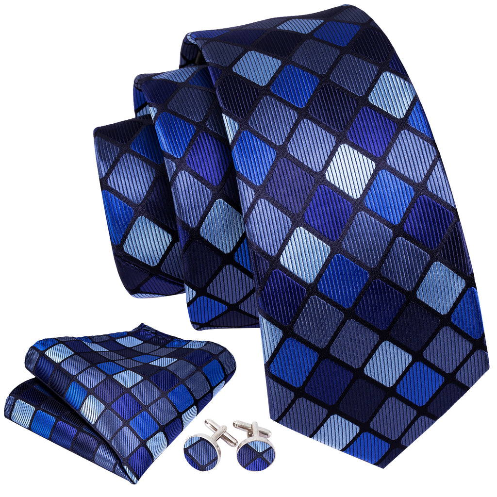 Barry. Wang Men's Navy Blue Necktie Plaid Silk Tie Hanky Cufflinks Set