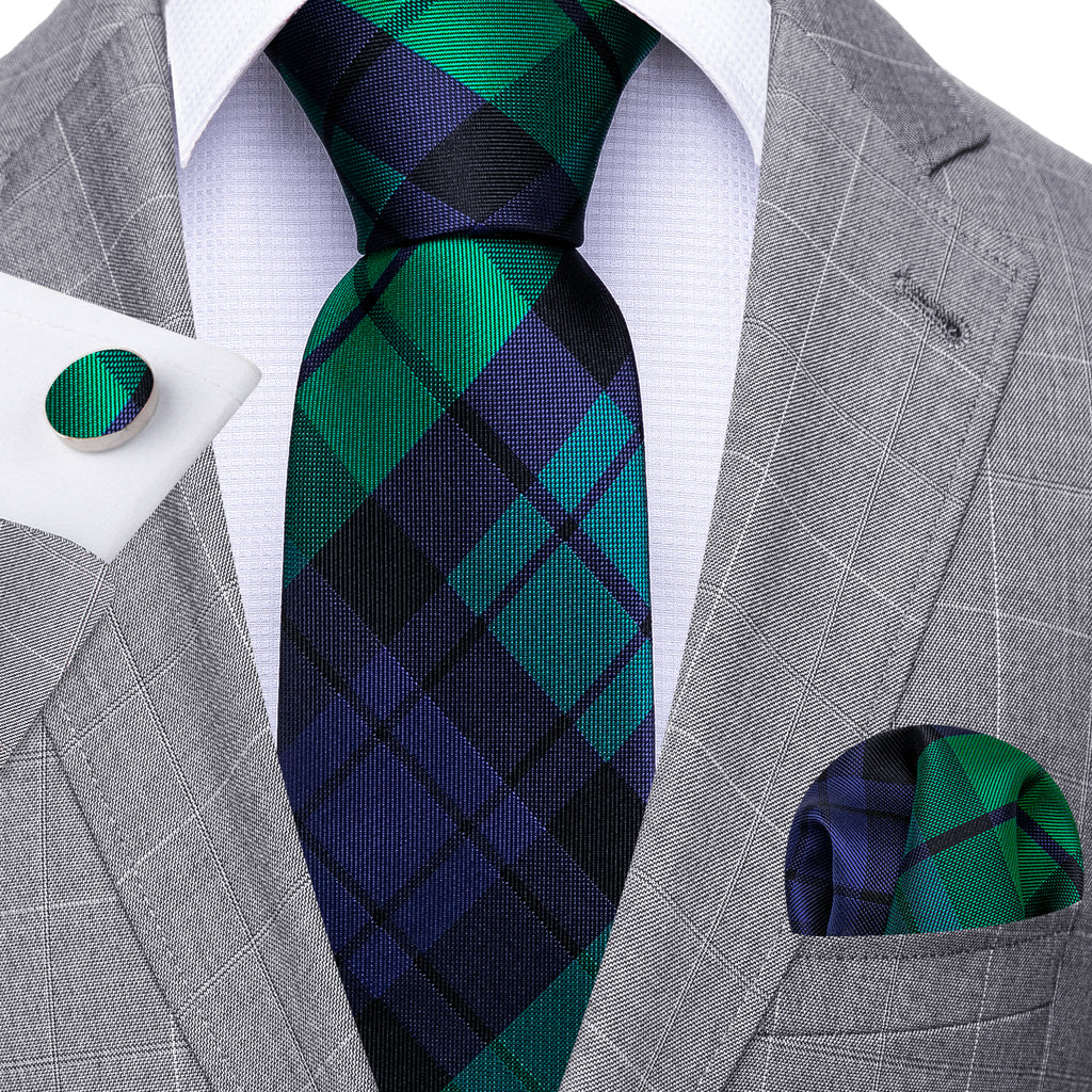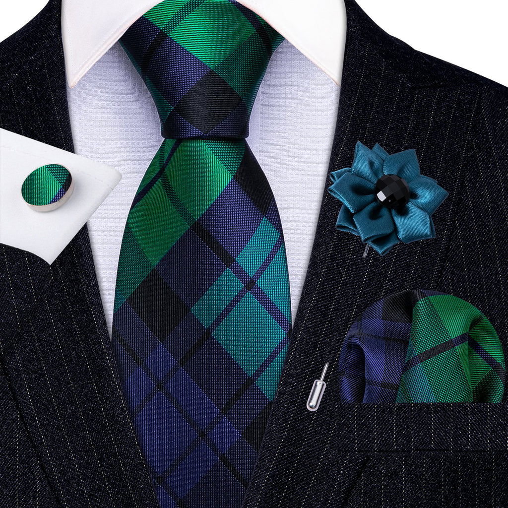 Barry. Wang Blue Green Plaid Striped Silk Tie Hanky Cufflinks Set With Lapel Pin Brooch Set