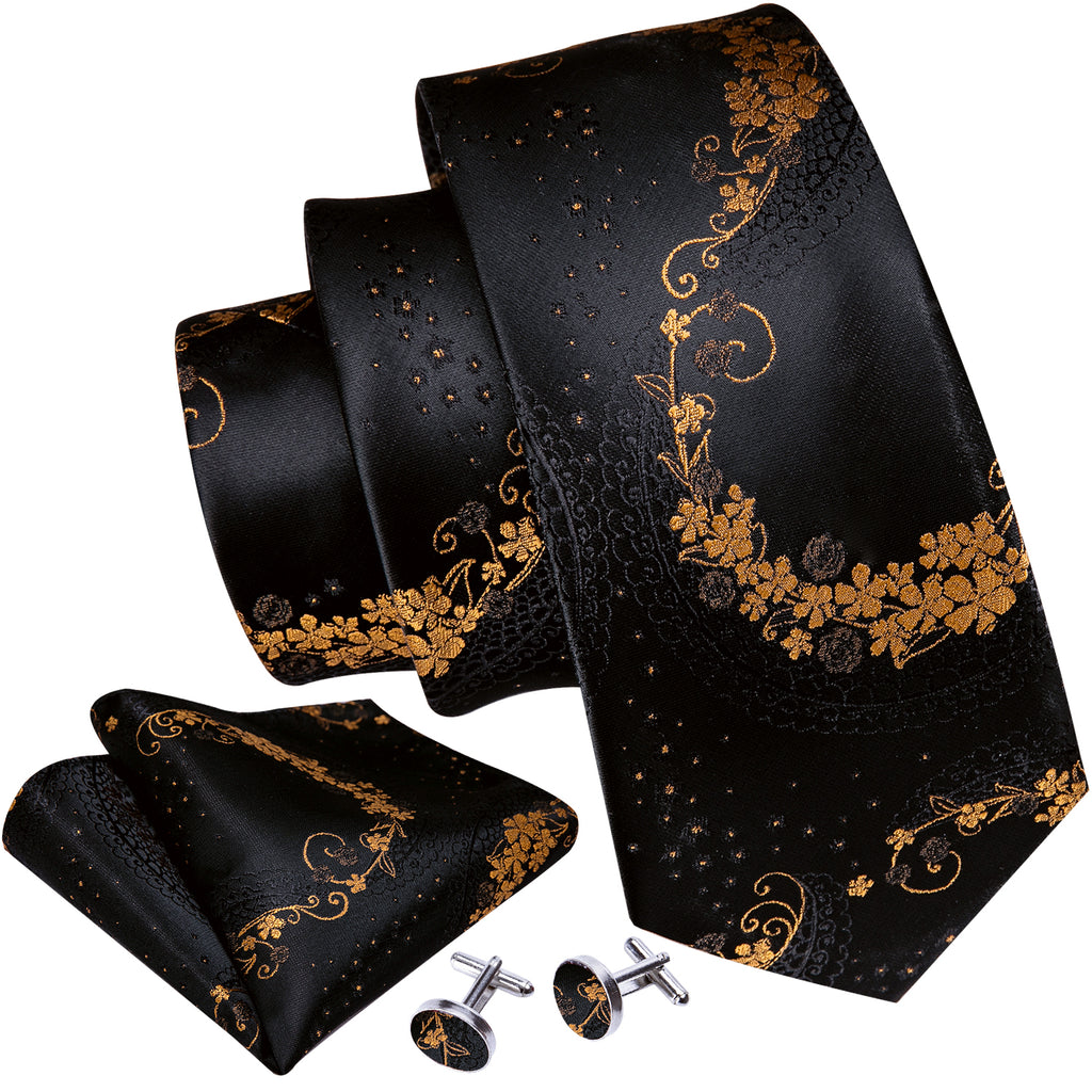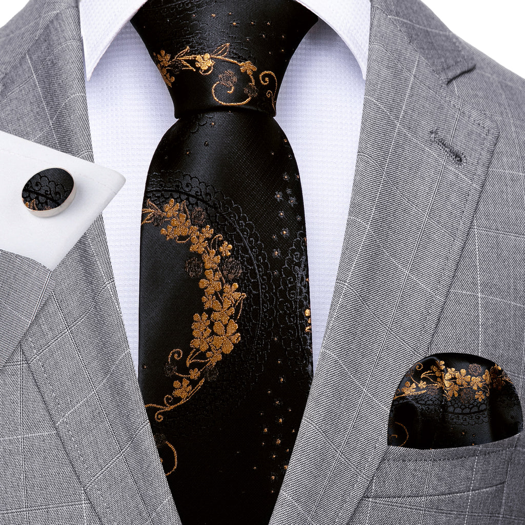 Barry. Wang Novelty Black Brown Floral Silk Tie Hanky Cufflinks Set