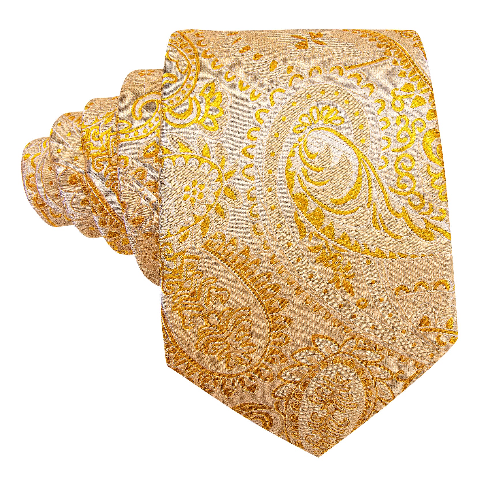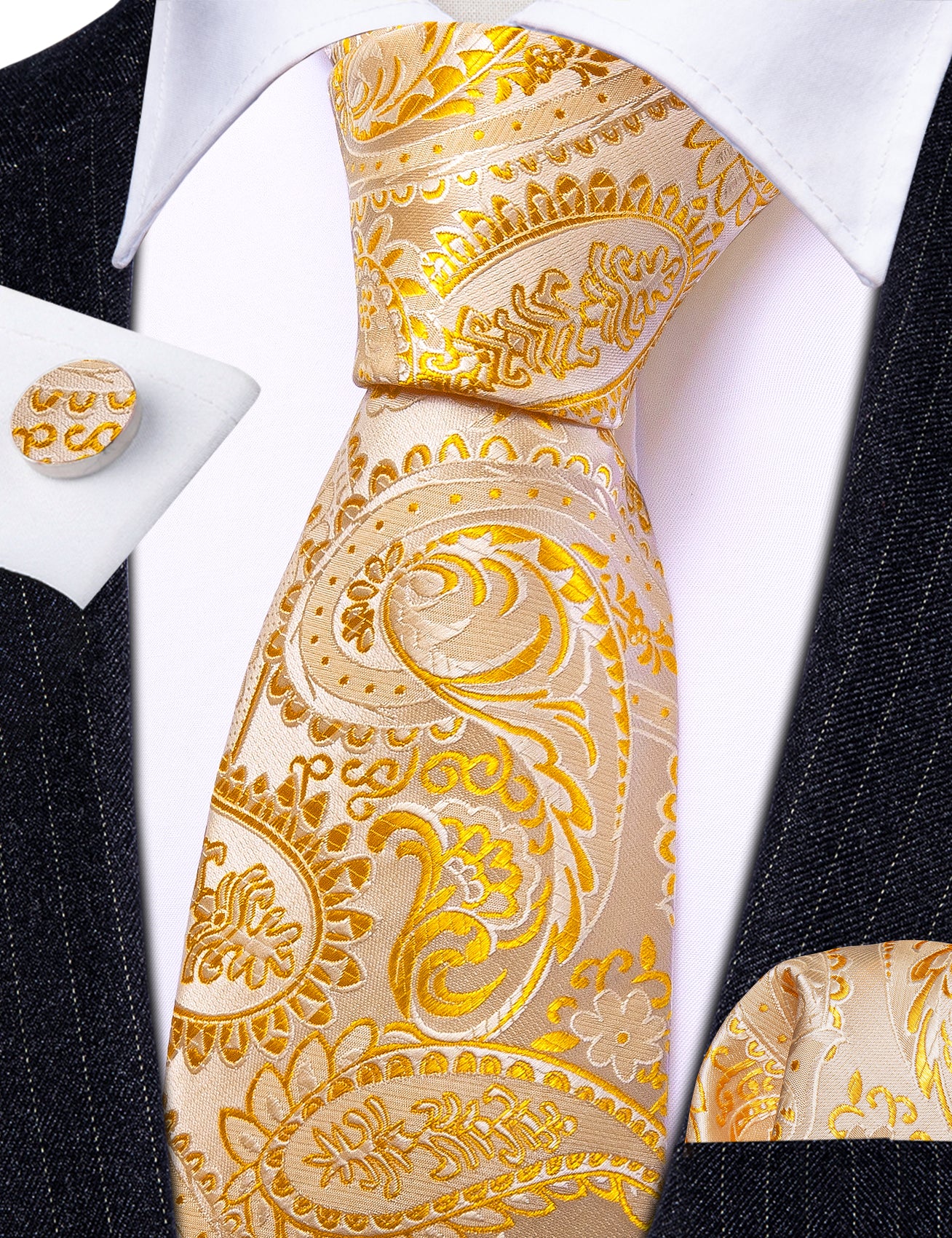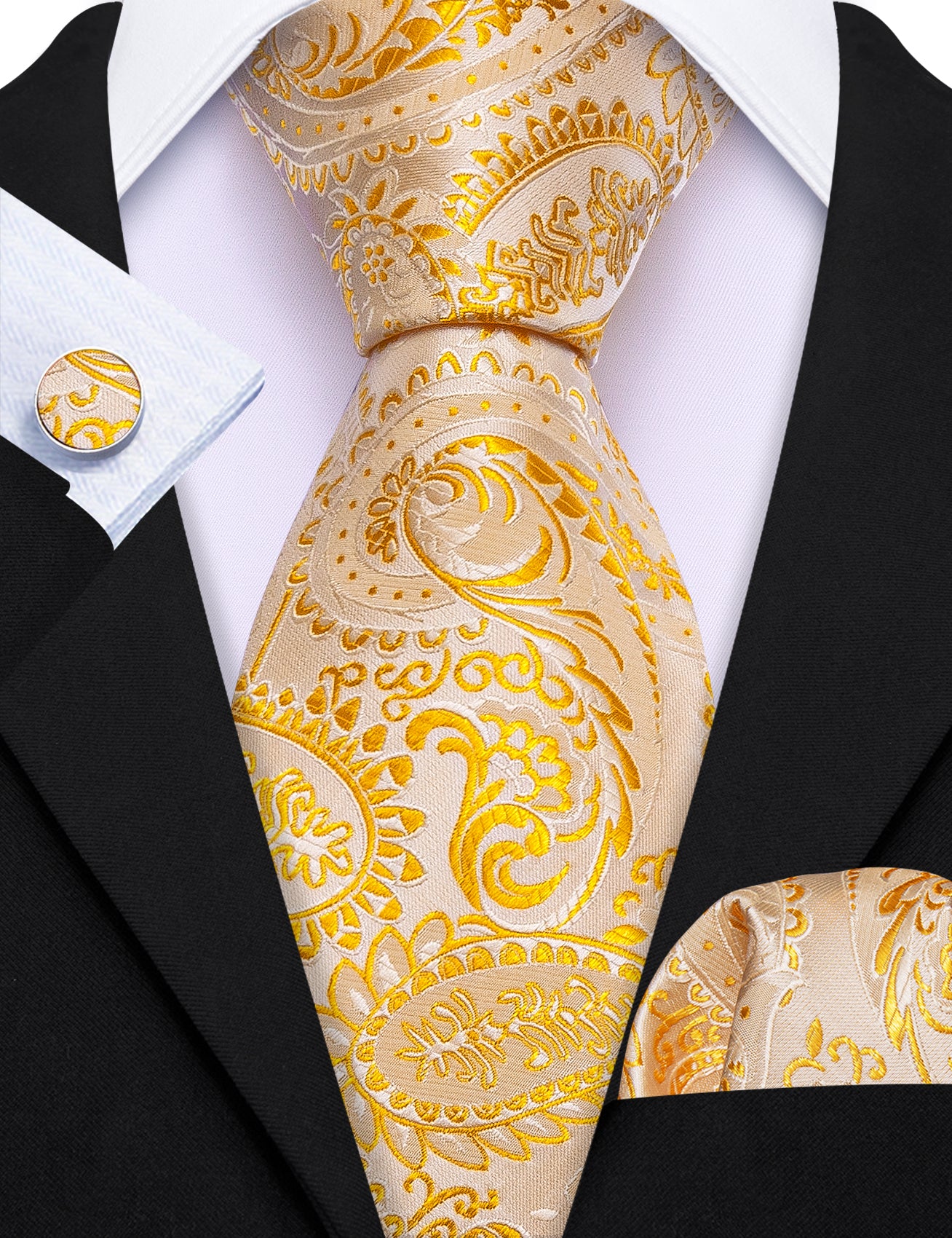 Barry. Wang Light Orange Silver Paisley Tie Handkerchief Cufflinks Set