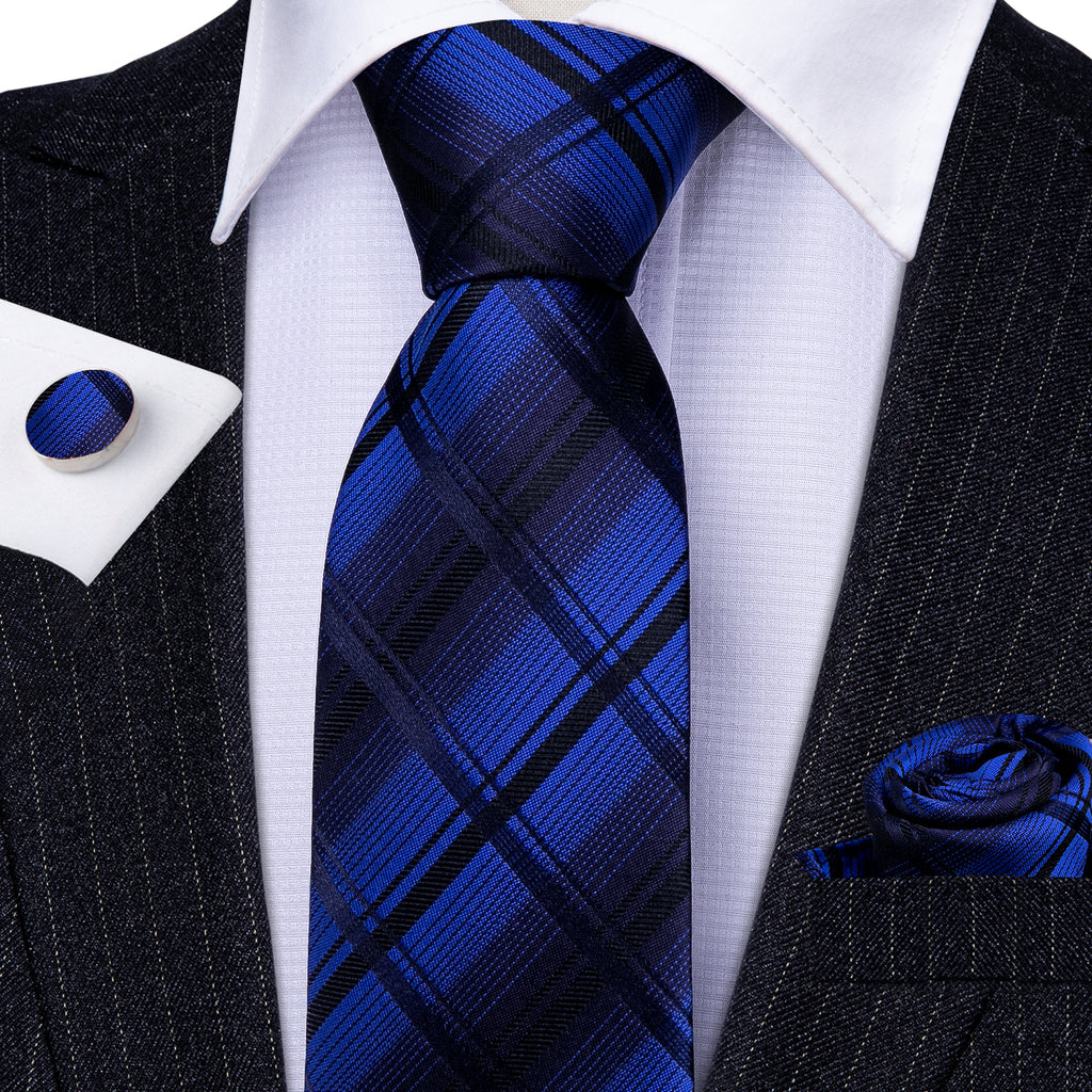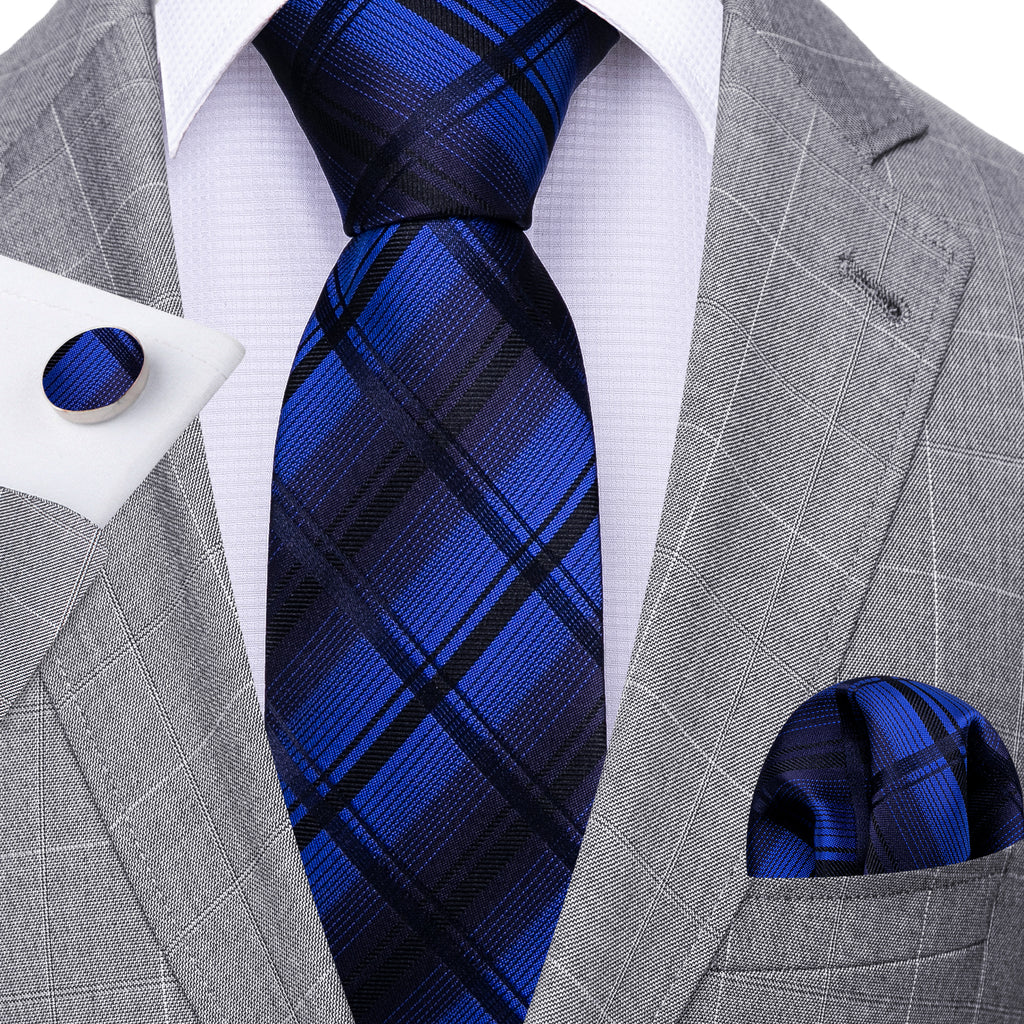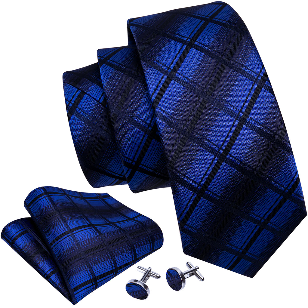 Barry. Wang Checkered Tie Blue Black Plaid Silk Tie Hanky Cufflinks Set