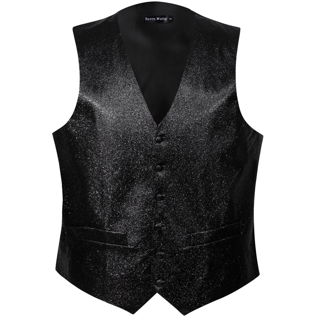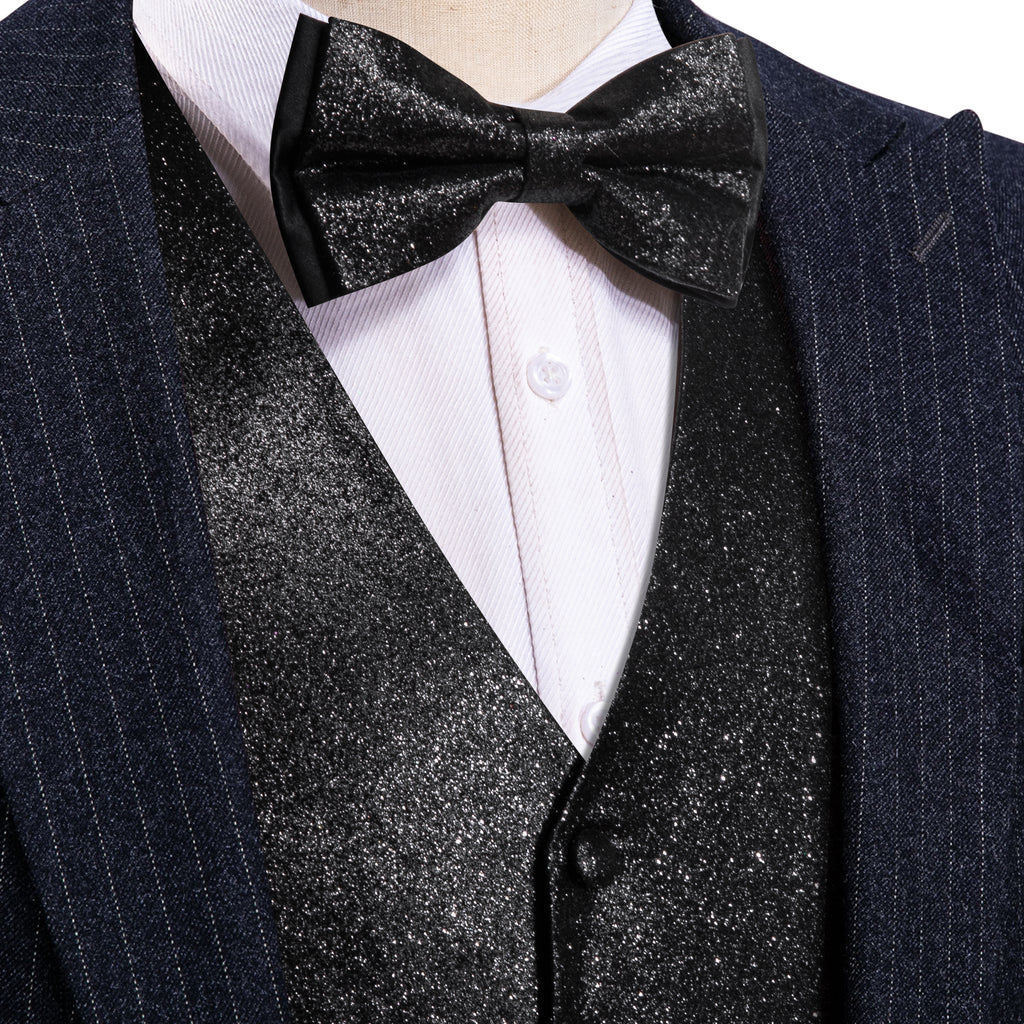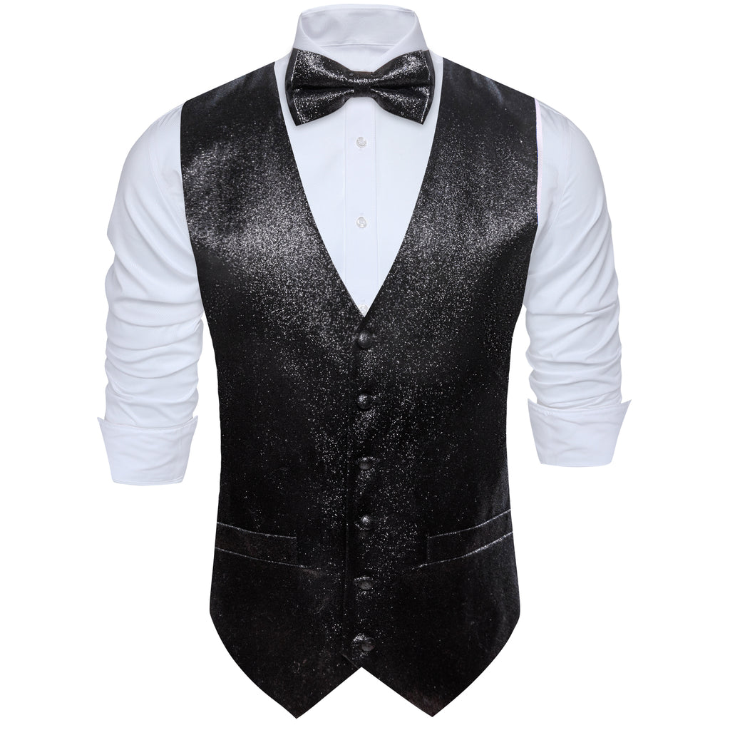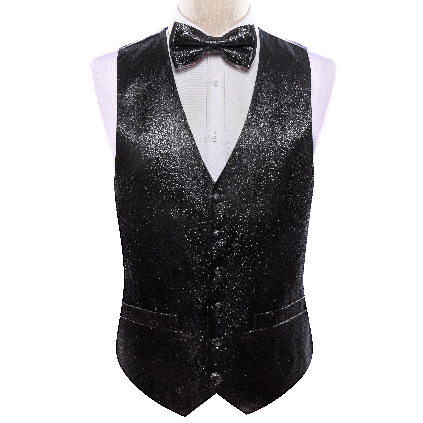 Barry. Wang Shining Men's Black Solid Silk Bowtie V-Neck Waistcoat Vest Set