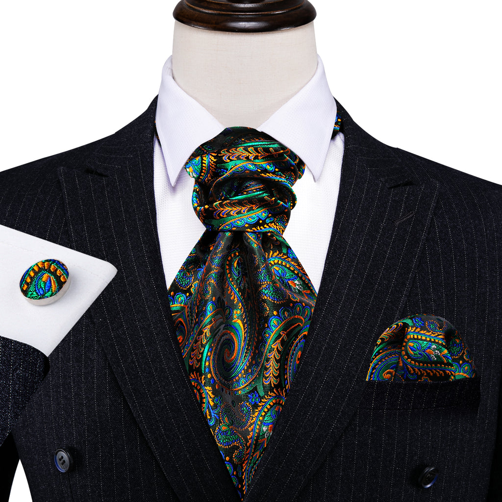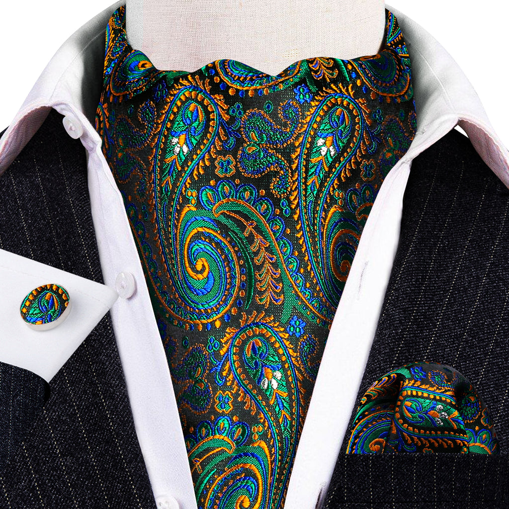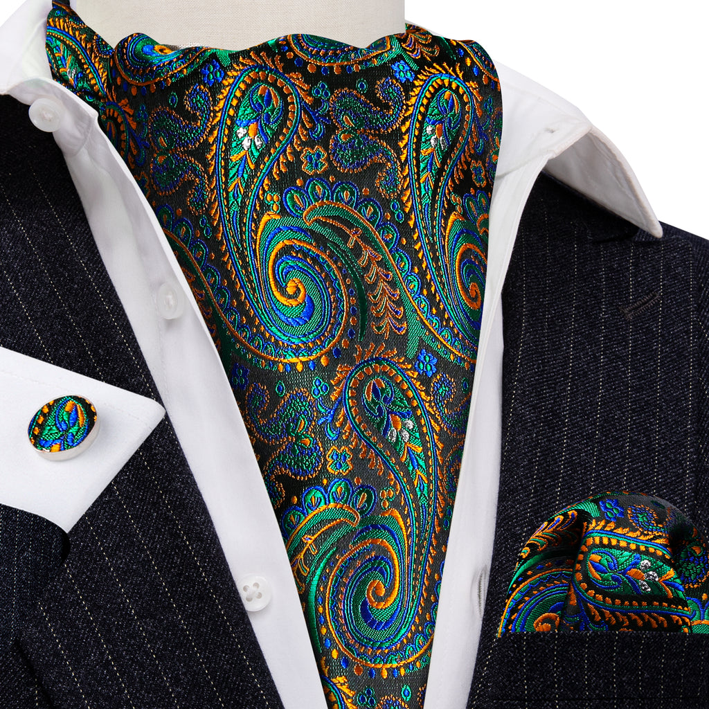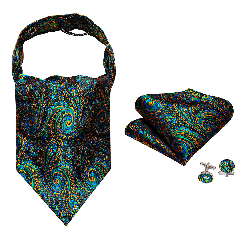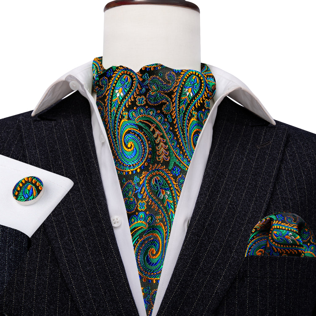 Barry. Wang Men's Ascot Paisley Green Teal Silk Cravat Wedding Neck Tie Handkerchief Cufflinks Set