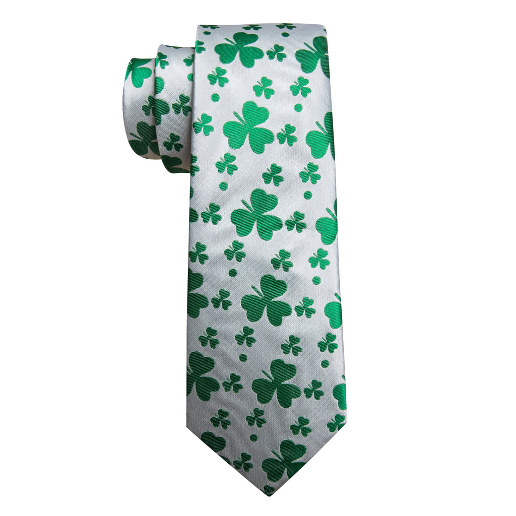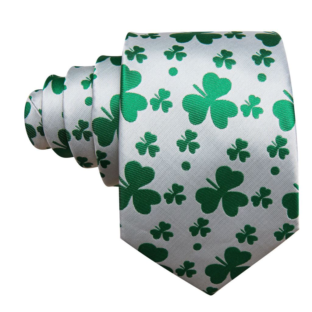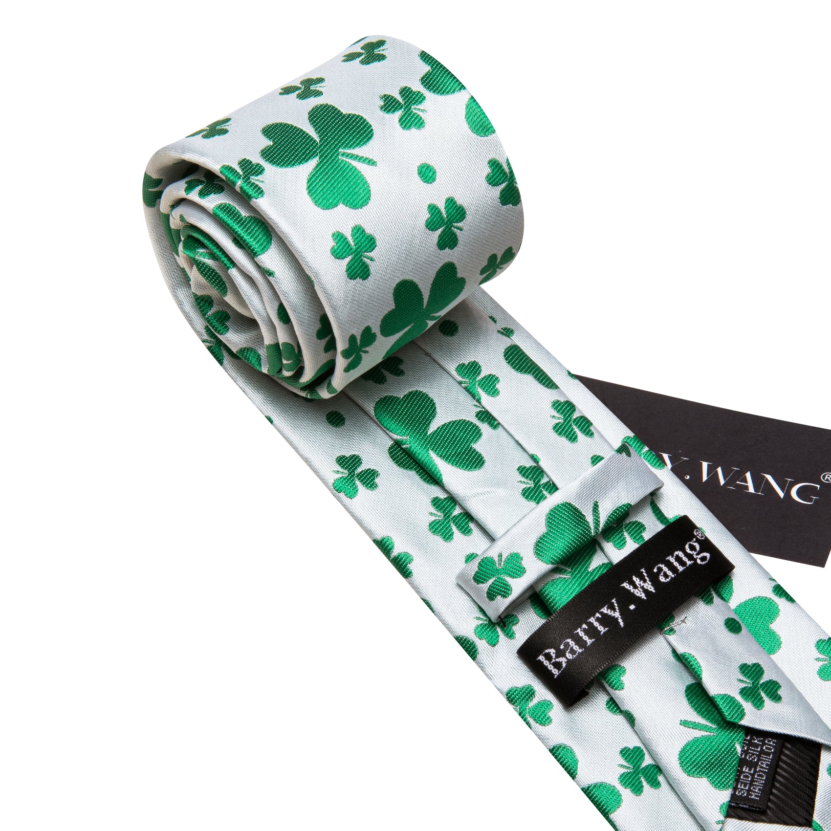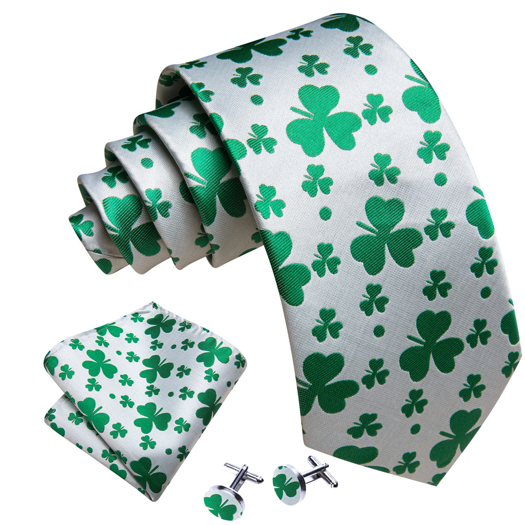 Barry. Wang White Green Clover Silk Tie Handkerchief Cufflinks Set
