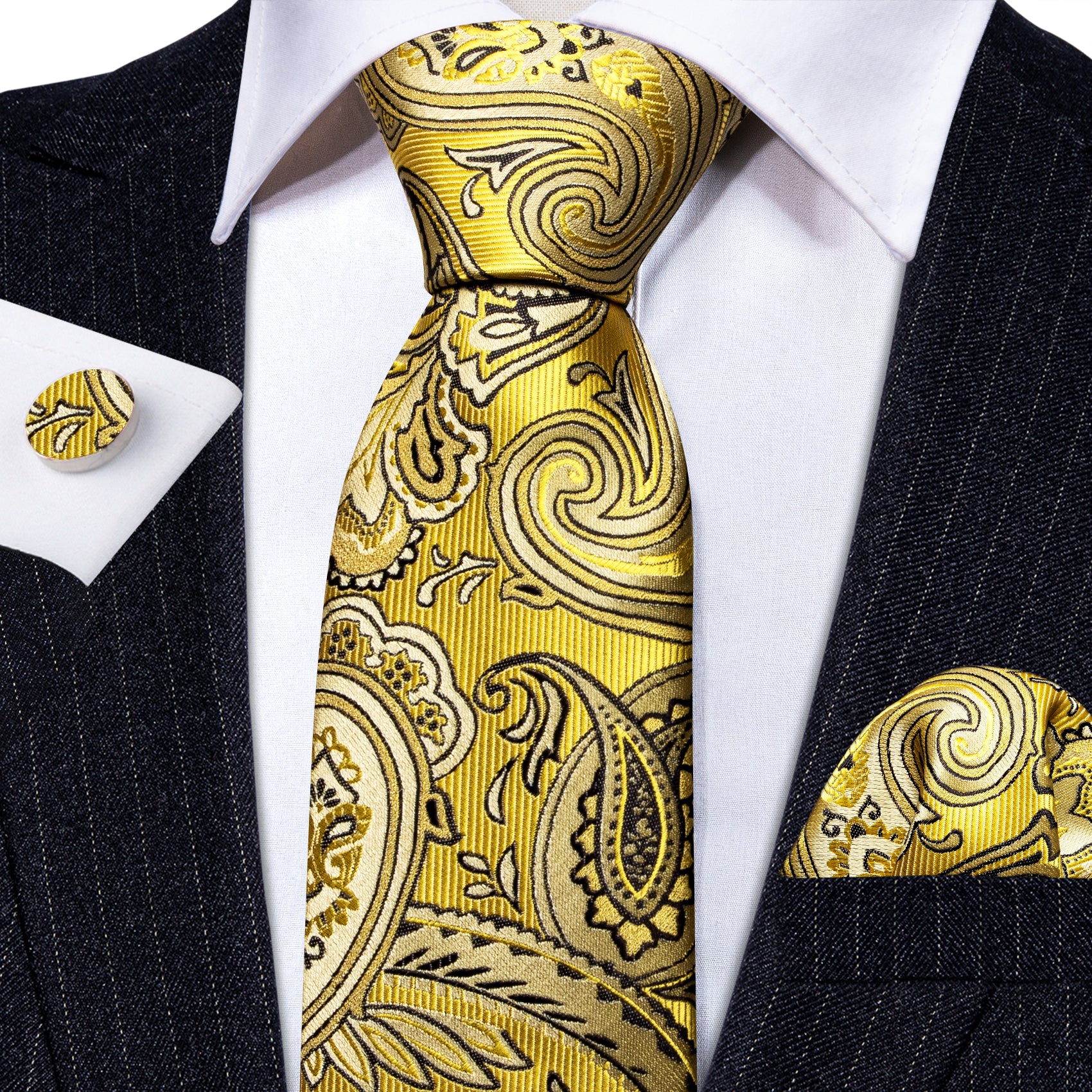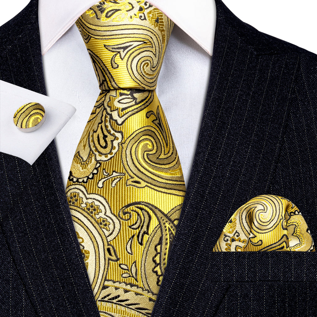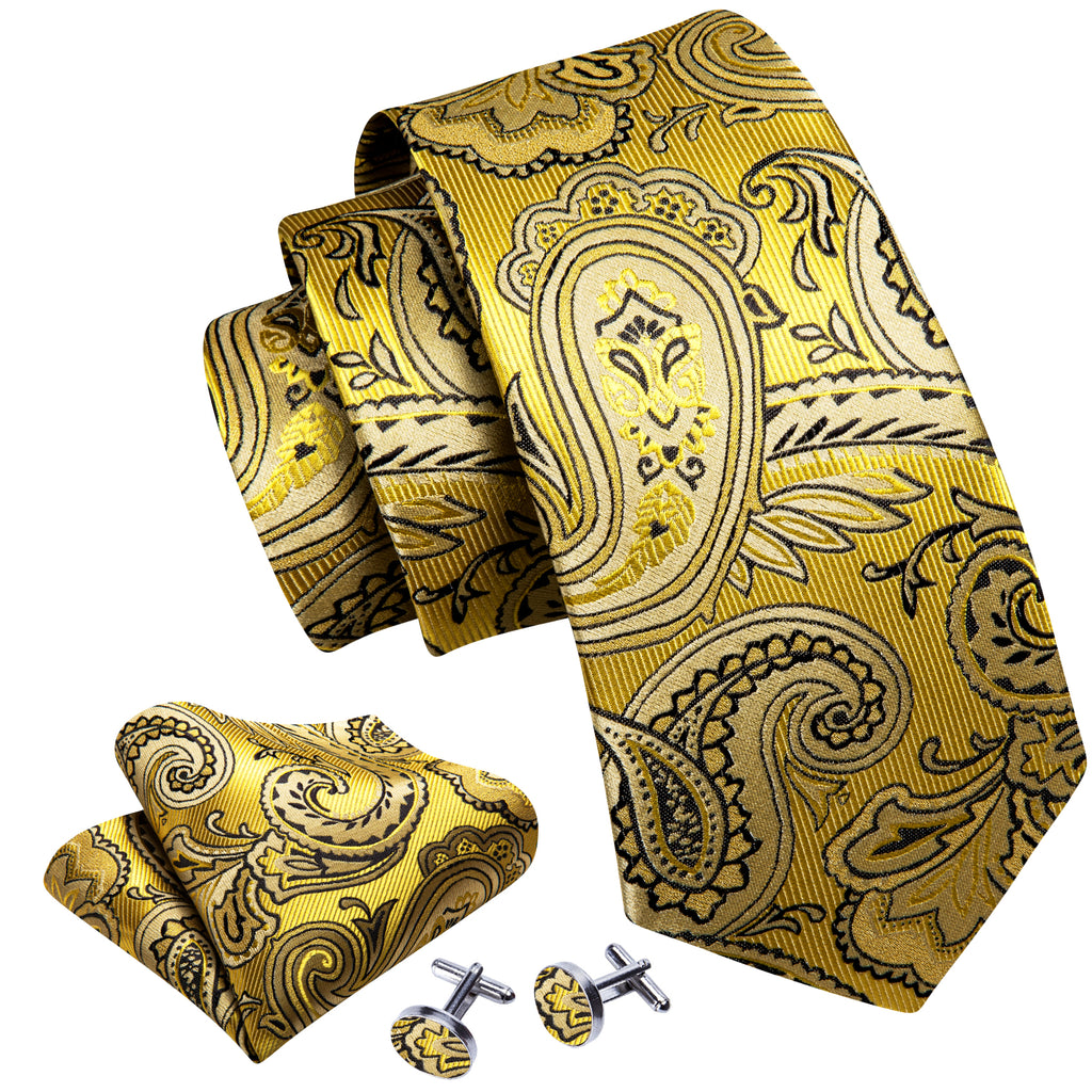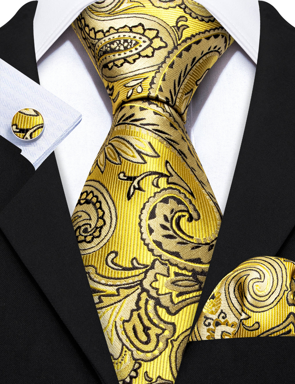 Barry. Wang Neck Tie Yellow Black Silk Tie Pocket Square Cufflinks Set
